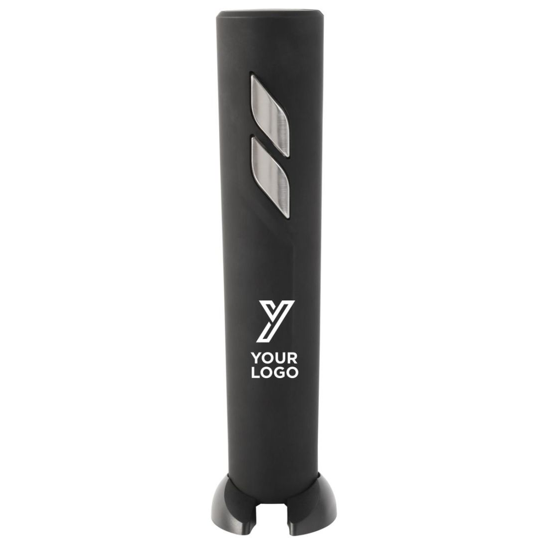 Abrebotellas eléctrico de ABS con acabado en negro mate. Se maneja con dos botones plateados y el soporte sirve como cortacápsulas. Pilas incluidas.