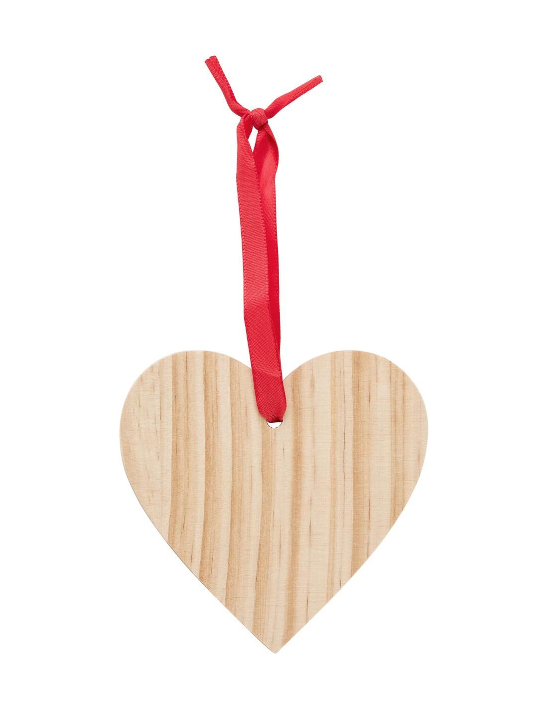 Adorno navideño de madera con forma de corazón. Incluye una cinta roja para colgarlo del árbol.