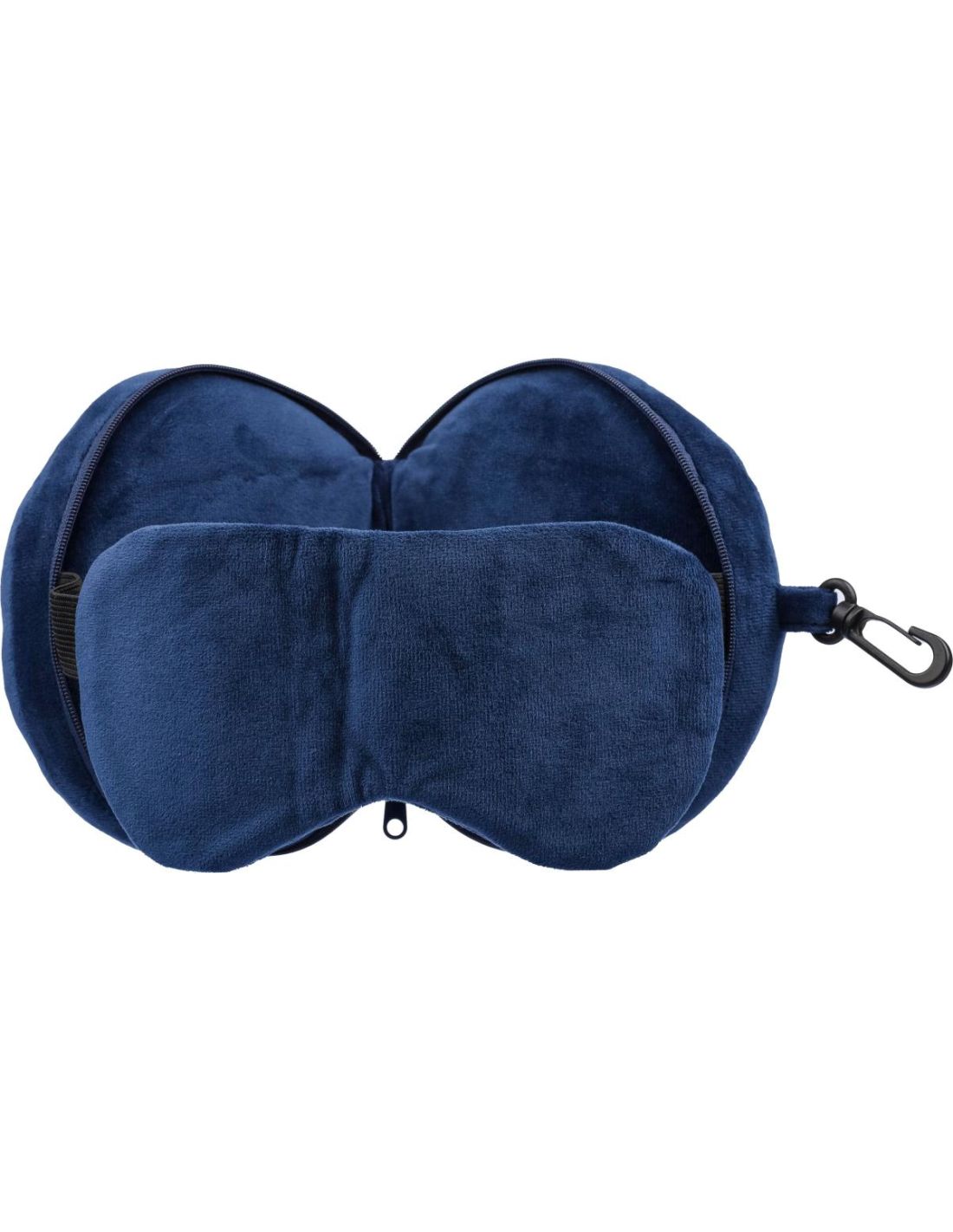 Almohada de viaje de poliéster con relleno de poliéster suave y algodón PP. Incluye un antifaz y una almohada y se cierra con una cremallera. Cuenta con un mosquetón de PP para sujetarlo fácilmente durante el viaje.