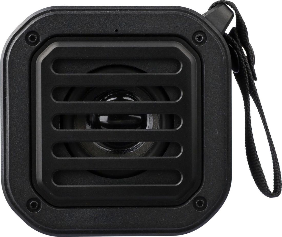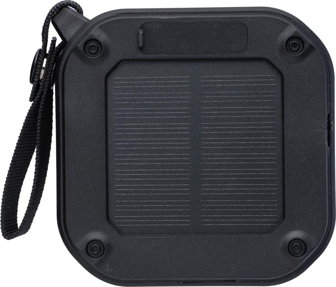 Altavoz de ABS reciclado, para exteriores, con muñequera y mosquetón. Clasificación IPX6. Salida de 3 W, entrada de 5 V CC, batería recargable incorporada de 400 mAh, con 4 horas de reproducción. Alcance de 15-20 metros, relación señal-ruido de 75 dB. Rango de frecuencia: 100 Hz a 20 kHz. Incluye cable de carga tipo C de 30 cm, linterna LED incorporada (30 lúmenes) y panel solar para extender el uso. Tecnología de conexión inalámbrica: 5.3. Presentado en una caja de cartón marrón.
