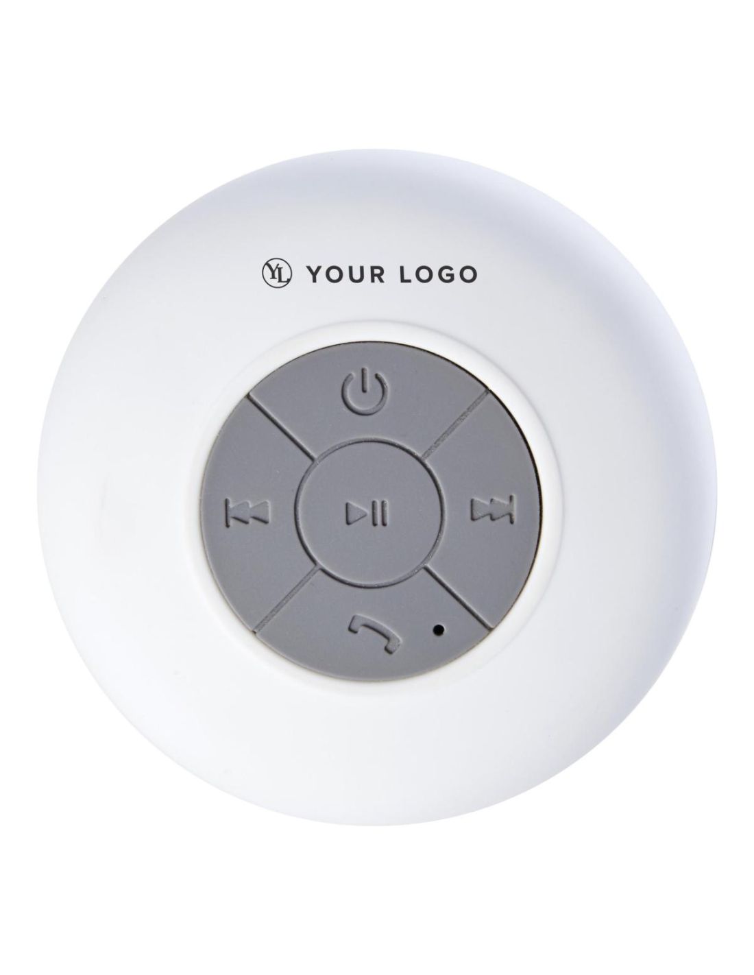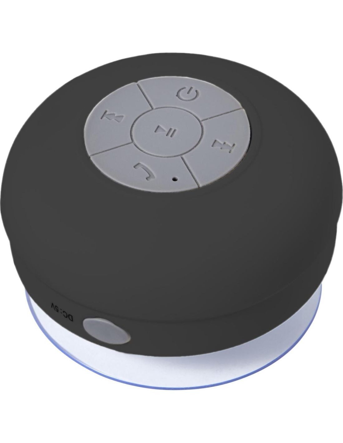 Altavoz inalámbrico de plástico engomado de 2W. Resistente al agua. Perfecto para responder llamadas en manos libres o escuchar música en la ducha. Con ventosa para colocarlo en superficies lisas. Autonomía 2h.