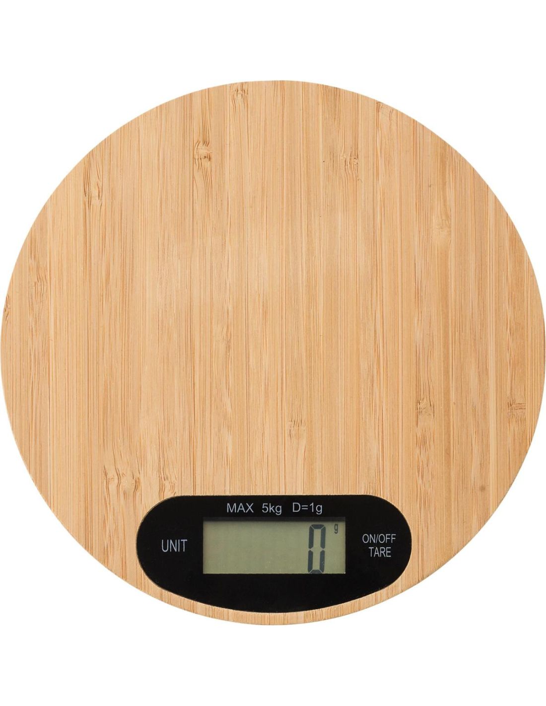 Báscula de cocina de bambú. Máx. 5 kg. Presentado en una caja de cartón.