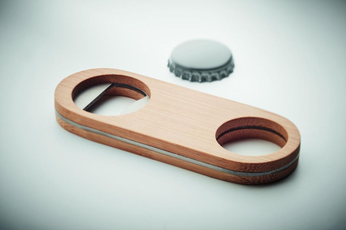 Abrebotellas de acero inoxidable con superficie de bambú. El bambú es un producto natural, puede haber ligeras variaciones en el color y el tamaño por artículo, lo que puede afectar el resultado final de la impresión. FSC®-certified | FSC 100%, N5.7, FSC-C213206