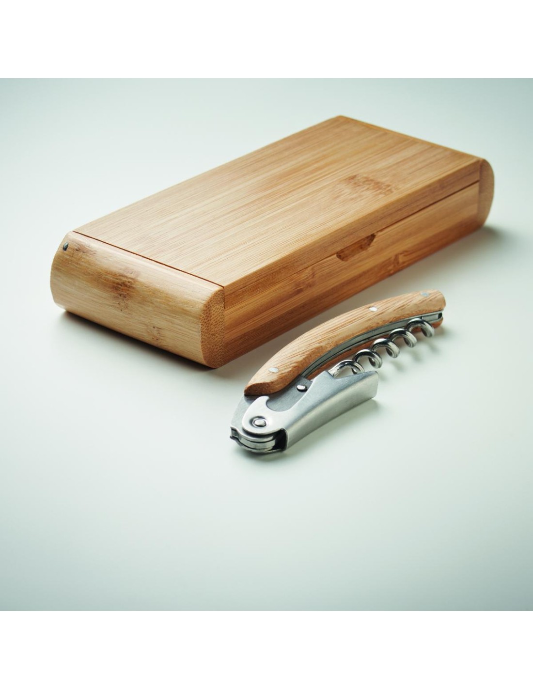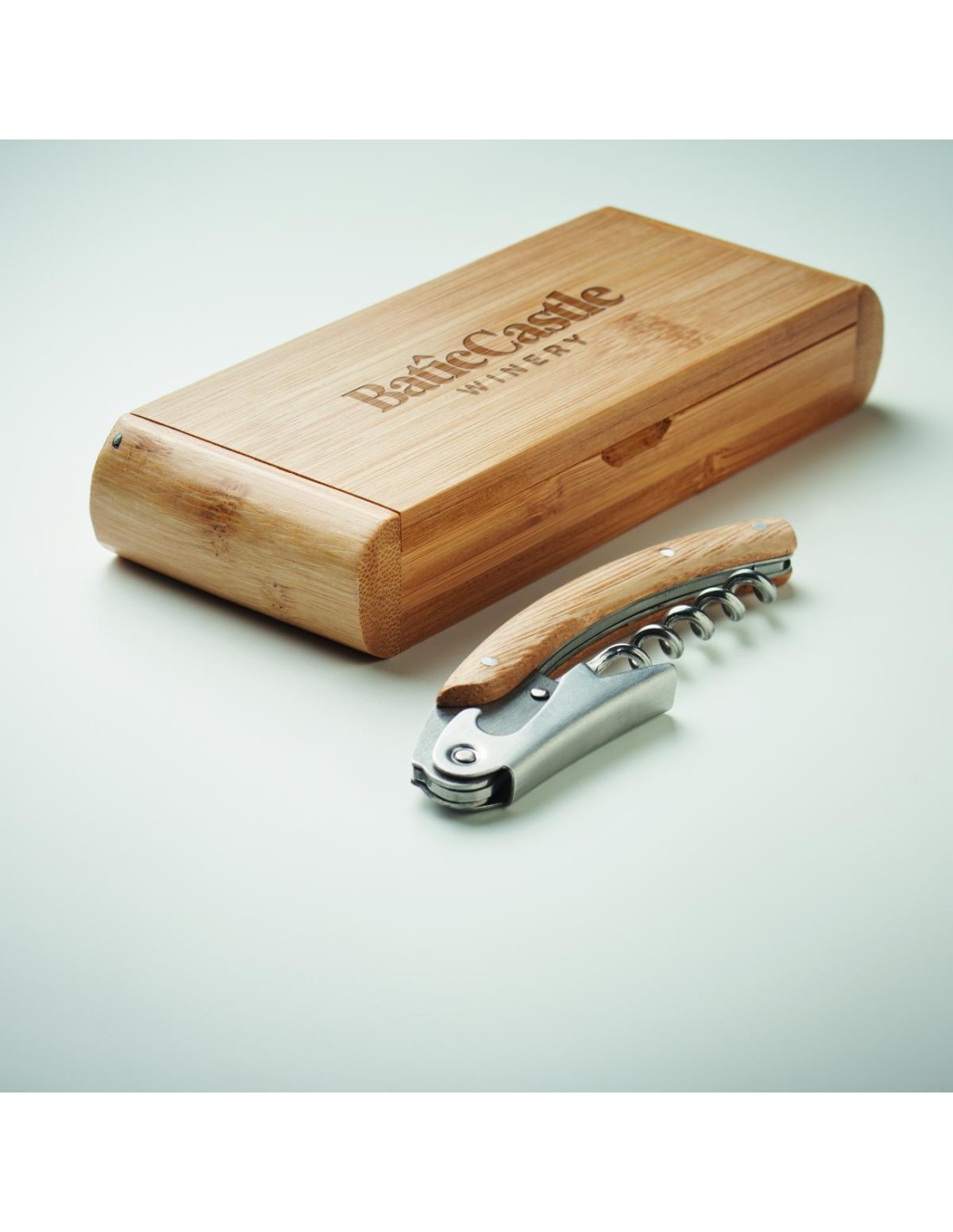 Abridor de vino de acero inoxidable, con doble sacacorchos y superficie de bambú. Presentado en caja de regalo de bambú. El bambú es un material natural, el color del articulo puede variar de unas piezas a otras.