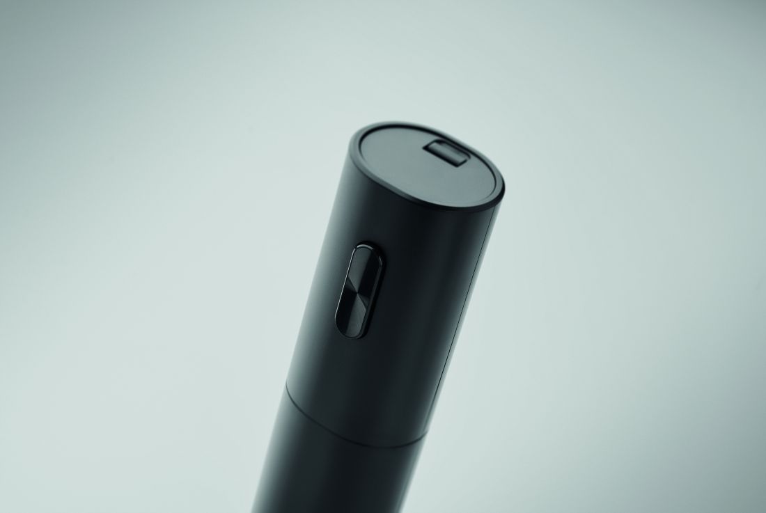 Abridor eléctrico de botellas de vino en carcasa de ABS con acabado negro mate. Excluye 4 pilas AAA.