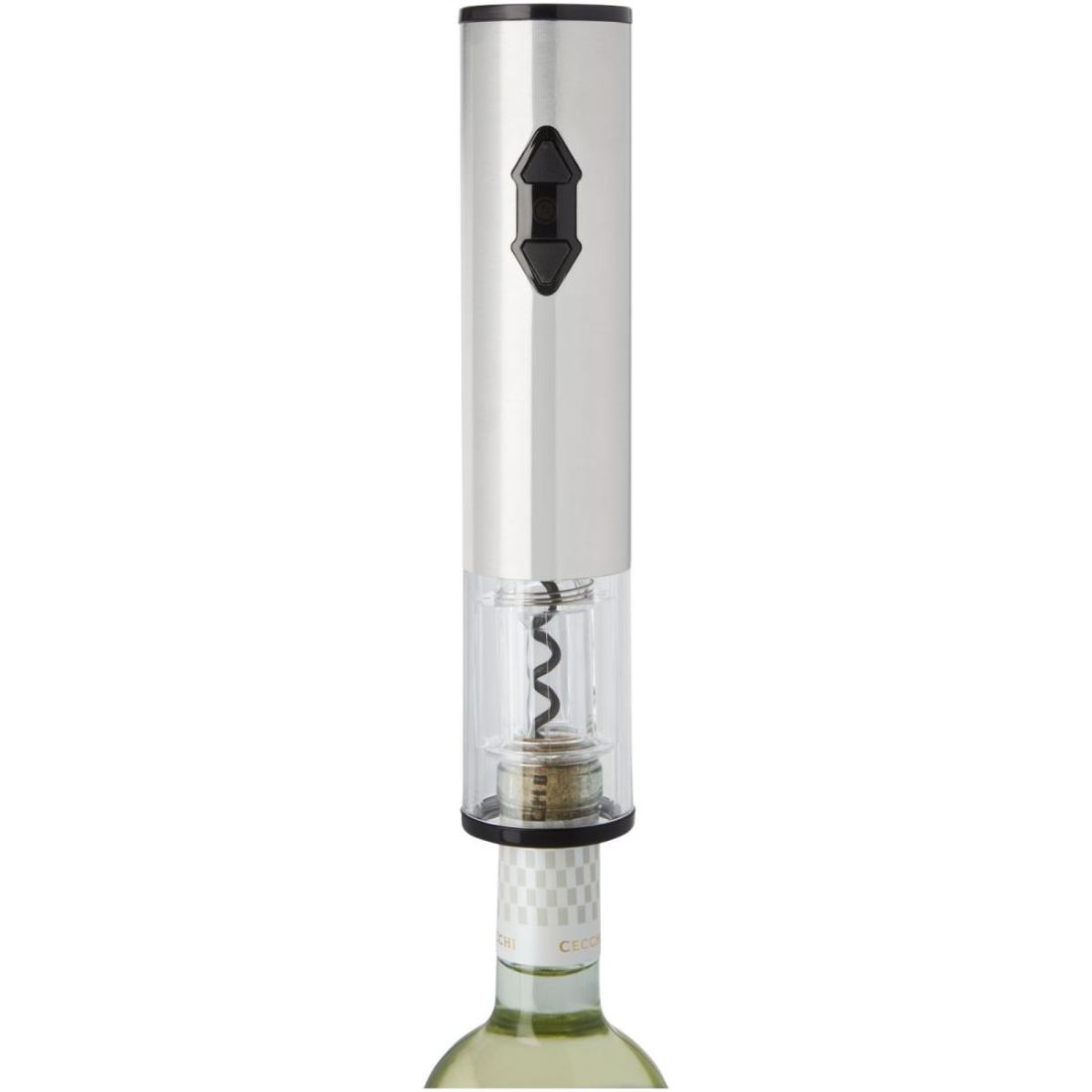 Abridor eléctrico para botellas de vino con un cortacápsulas, un decantador y un tapón. Funciona con 4 pilas AA (no incluidas).