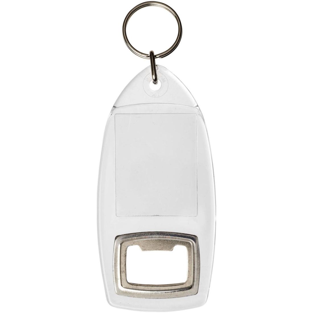 Llavero transparente R1 con abridor de botellas y anilla abierta de metal. La anilla de metal es de perfil plano, ideal para envíos por correo postal. Dimensiones del encarte impreso: 4 cm x 3,2 cm.