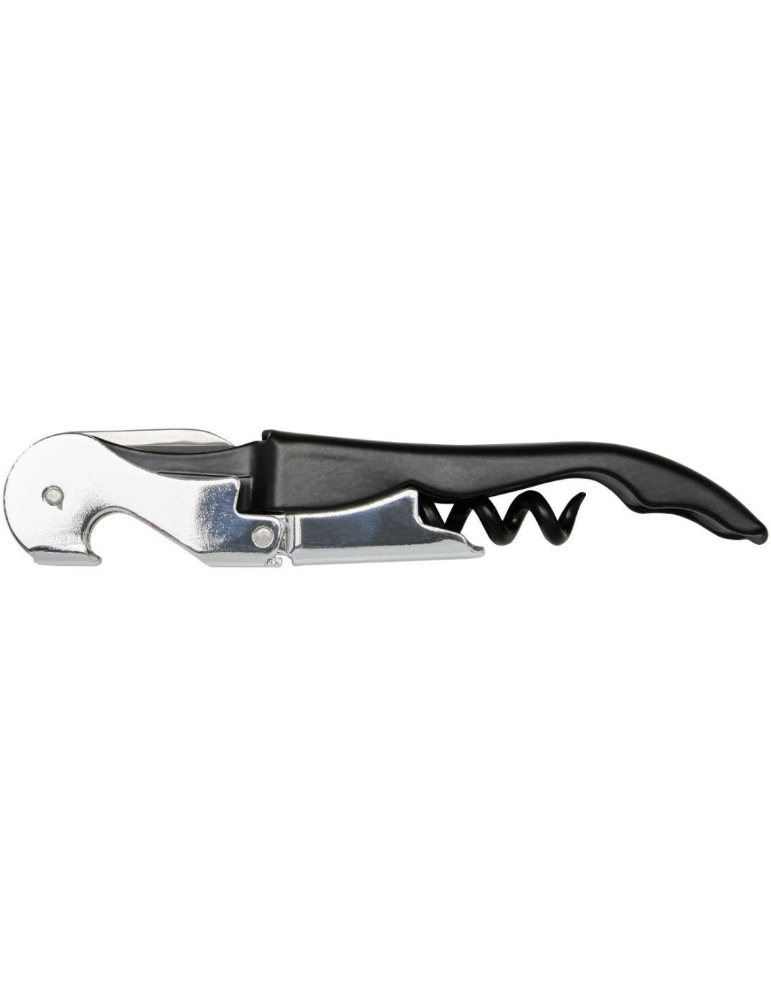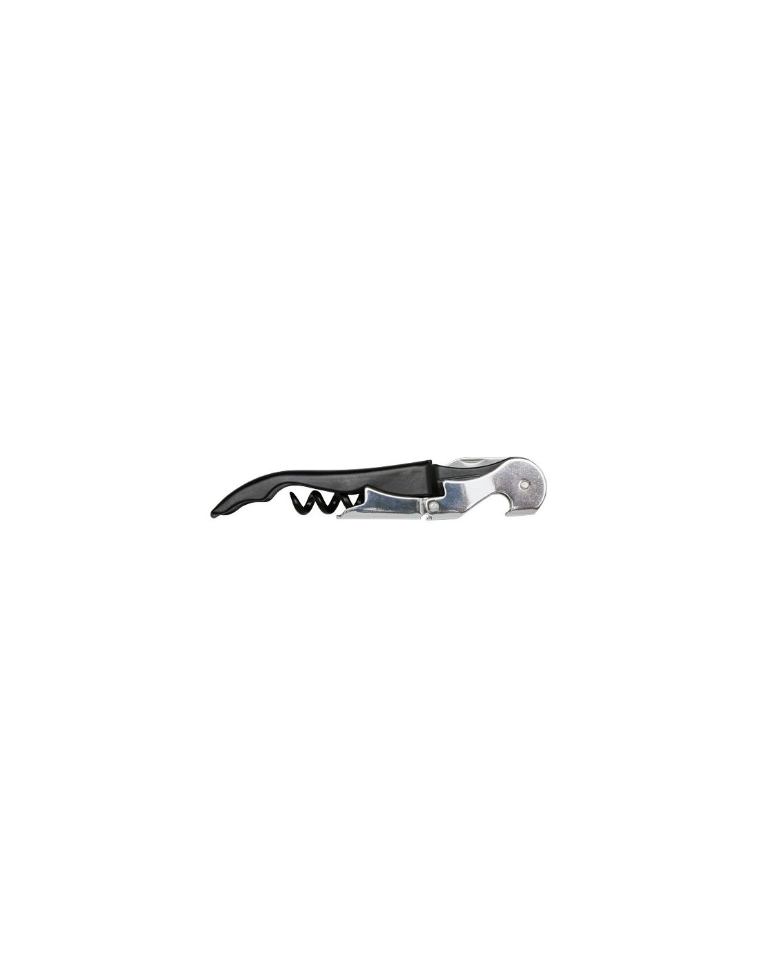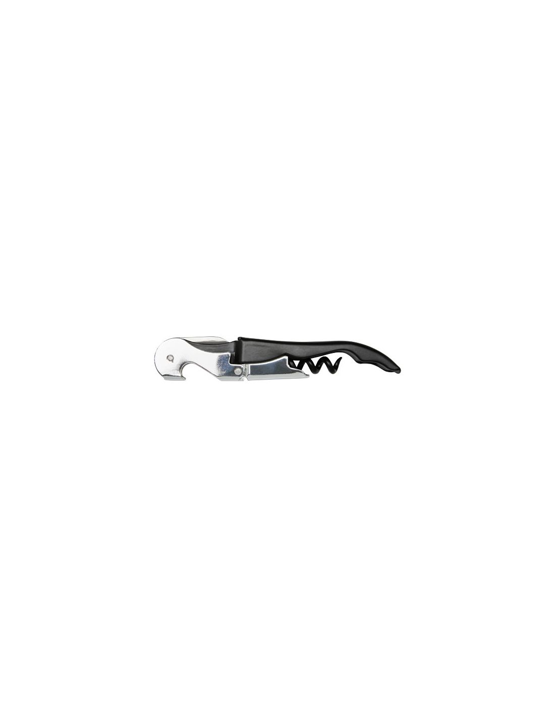 Un abridor de camarero de acero inoxidable con cuerpo colorido, sacacorchos, cortacápsulas y abrebotellas. Gracias a su estructura de dos tiempos es fácil sacar el corcho de la botella.