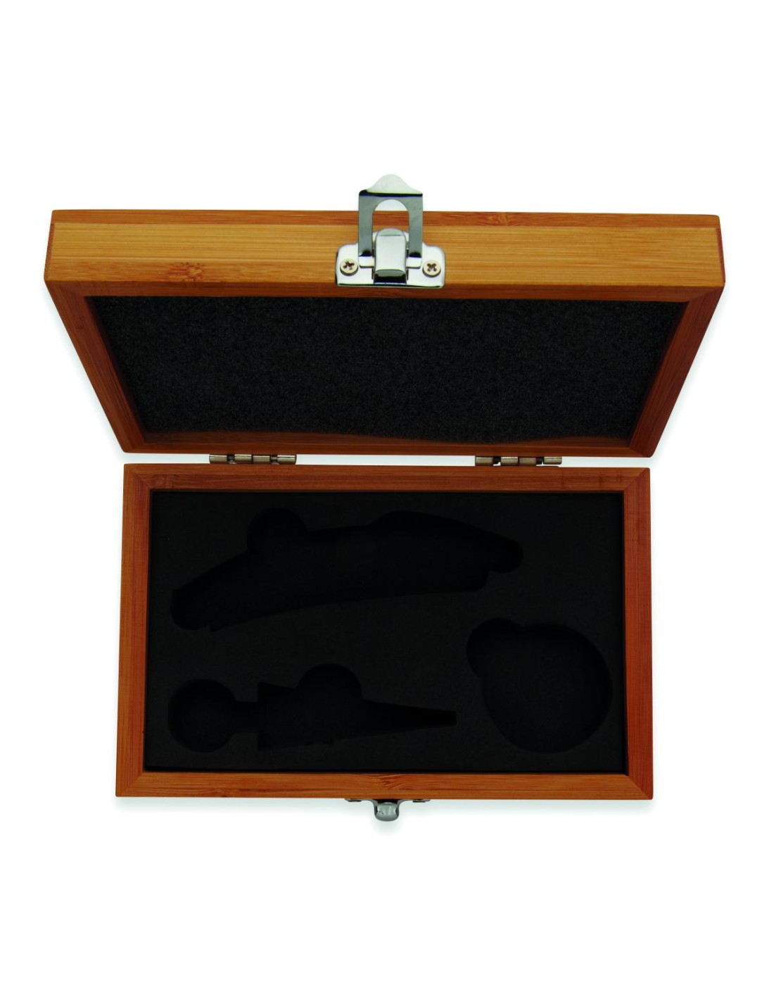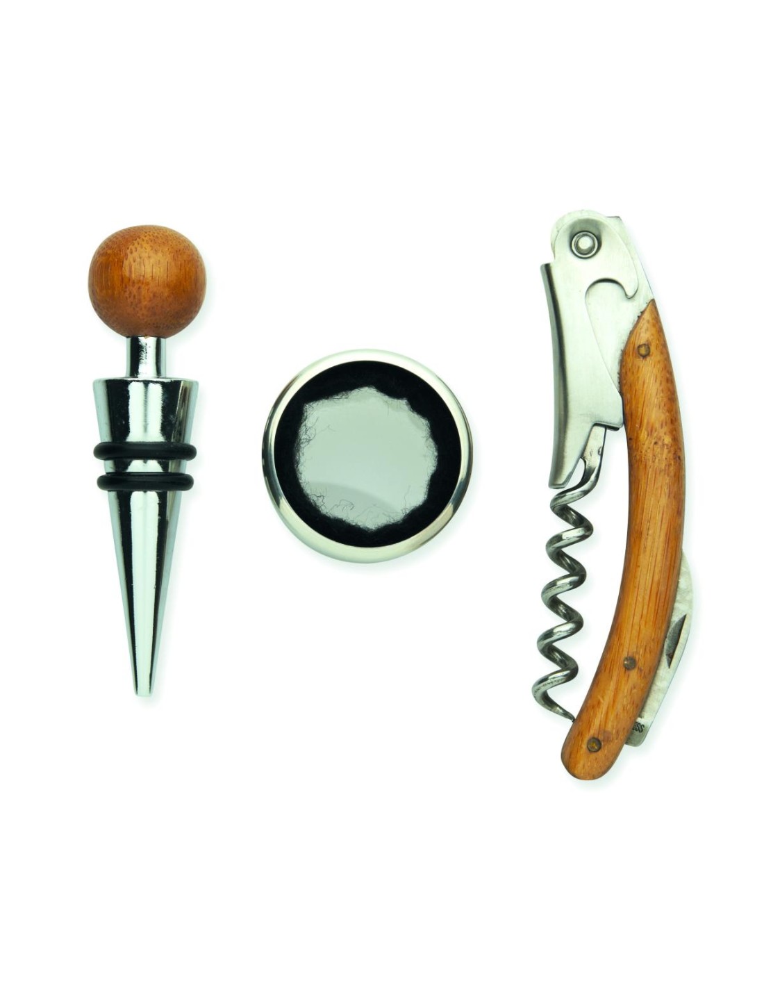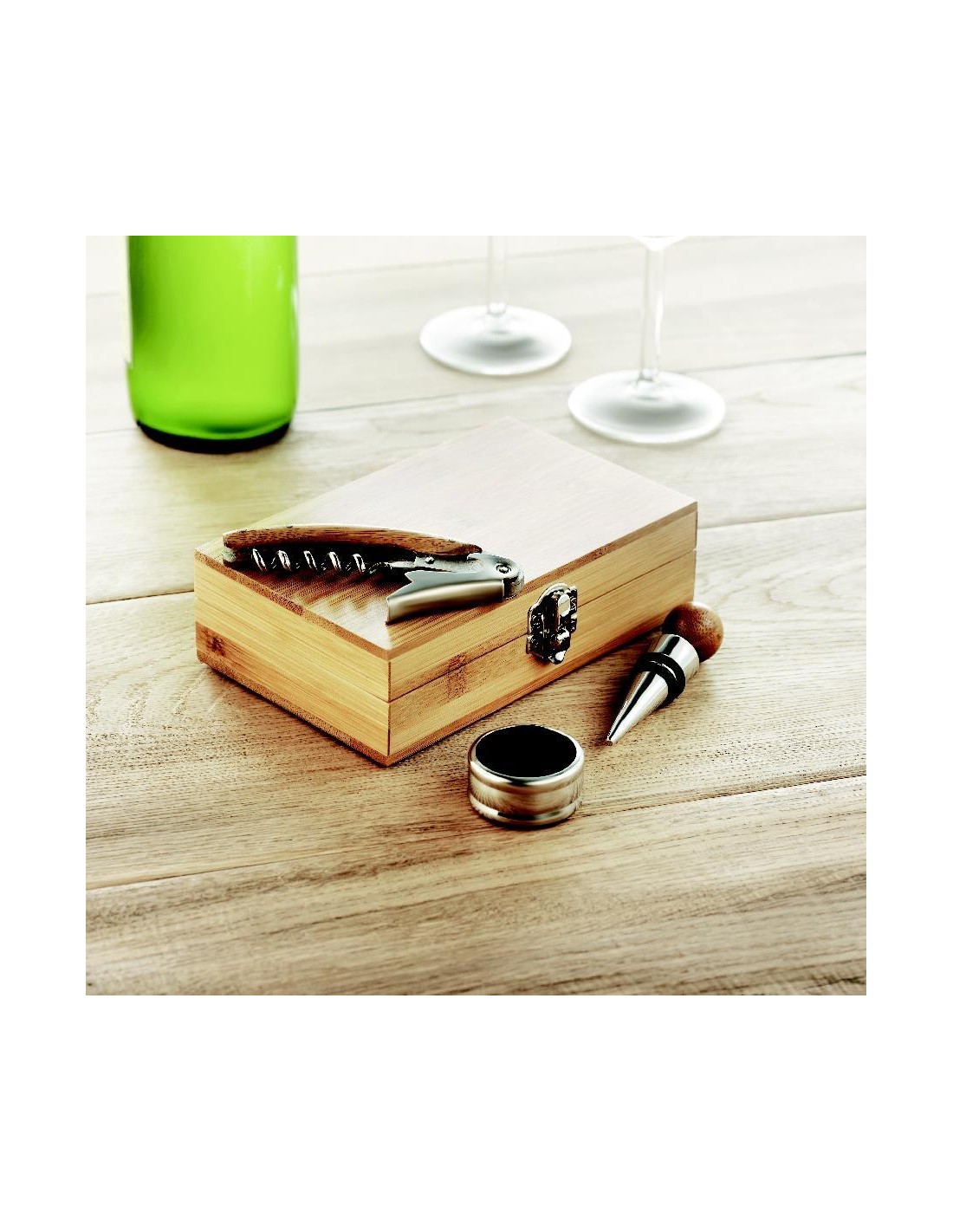 Set de vino en caja de bambú. incluye sacacorchos, collar de vino, tapón de acero inoxidable y bambú. El bambú es un material natural, el color del articulo, la medida y la impresión sobre el puede variar.