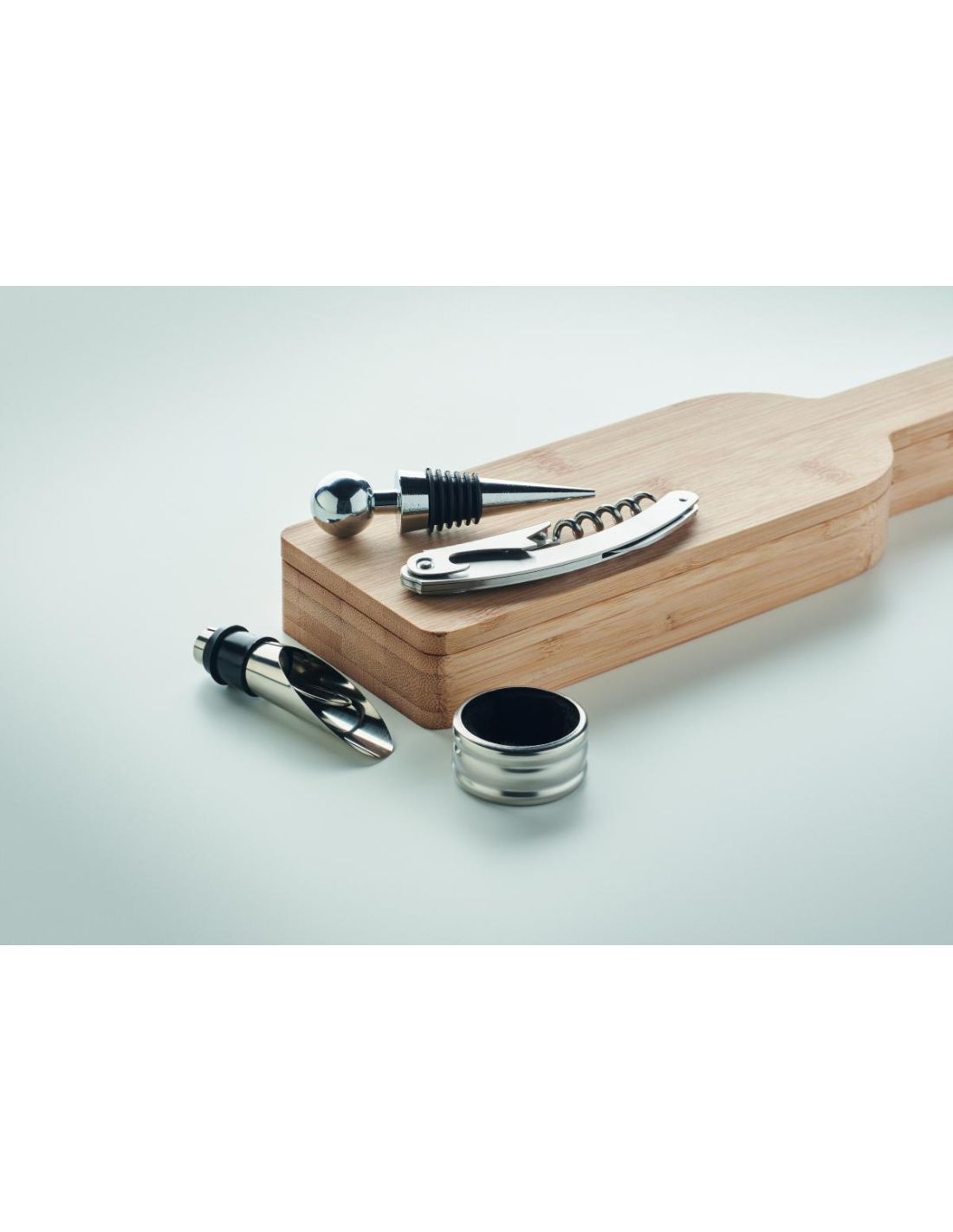 Set de vino en forma de botella en estuche de bambú. Incluye sacacorchos, vertedor de vino, tapón de botella y anillo de goteo de botella de vino.