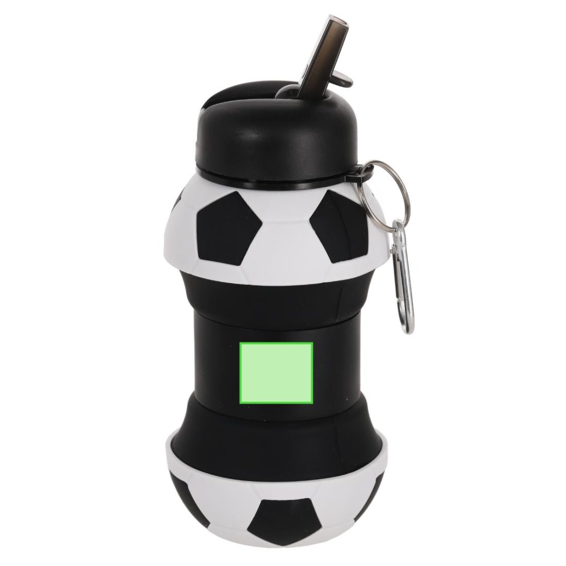 Bidón plegable con diseño de balón de futbol con capacidad de 550 ml. Incluye anilla metálica con mosquetón para práctico transporte. Tapa de rosca con boquilla. Libre de BPA.
