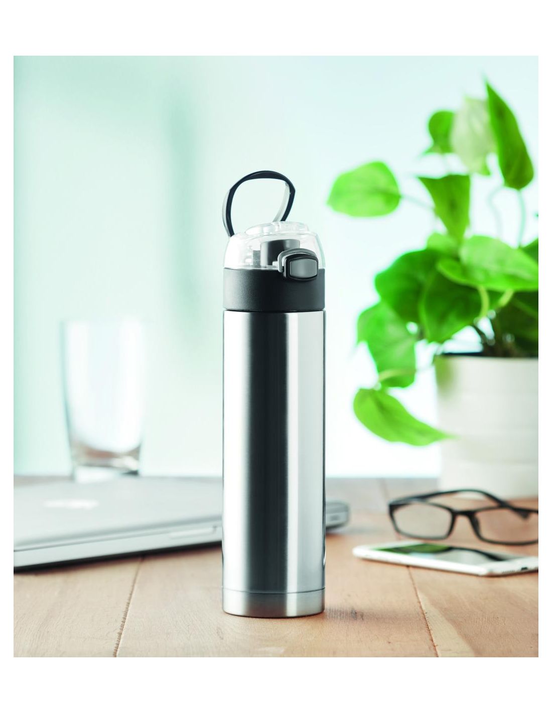 Botella de acero inoxidable de doble pared aislado al vacío. Dispone de cierre de seguridad en la tapa con botón para abrirla y asa plegable. Capacidad 400ml. Anti fugas.