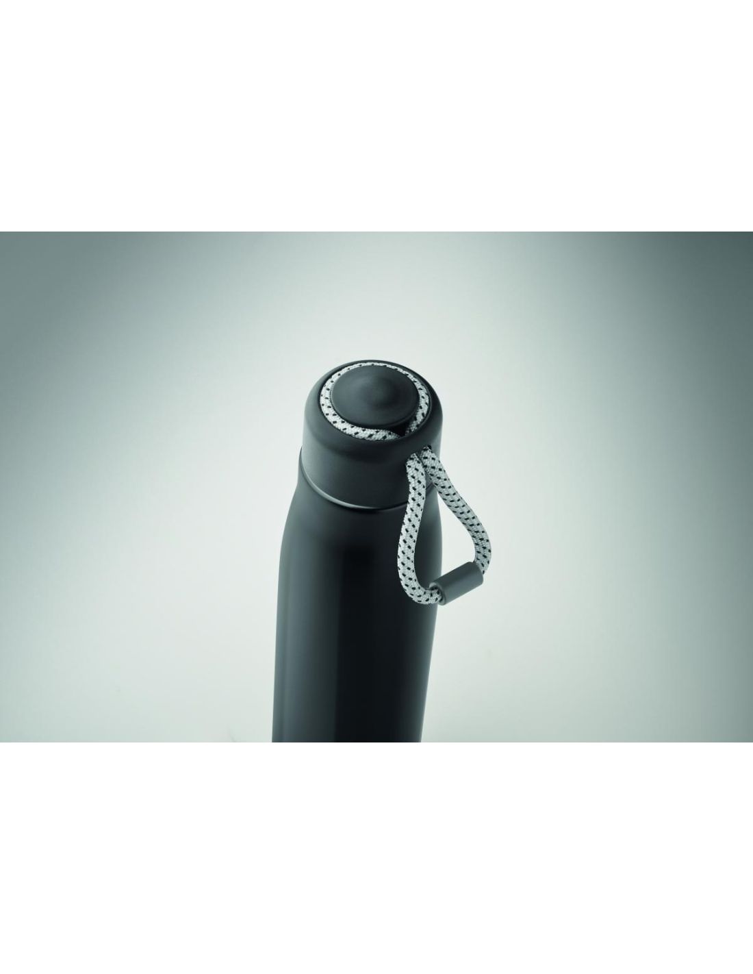 Botella de doble pared aislada al vacío de acero inoxidable reciclado (90% de acero inoxidable reciclado y 10% de acero inoxidable) con asa de cordón integrada en la tapa de PP. Antifugas. Capacidad: 500 ml.