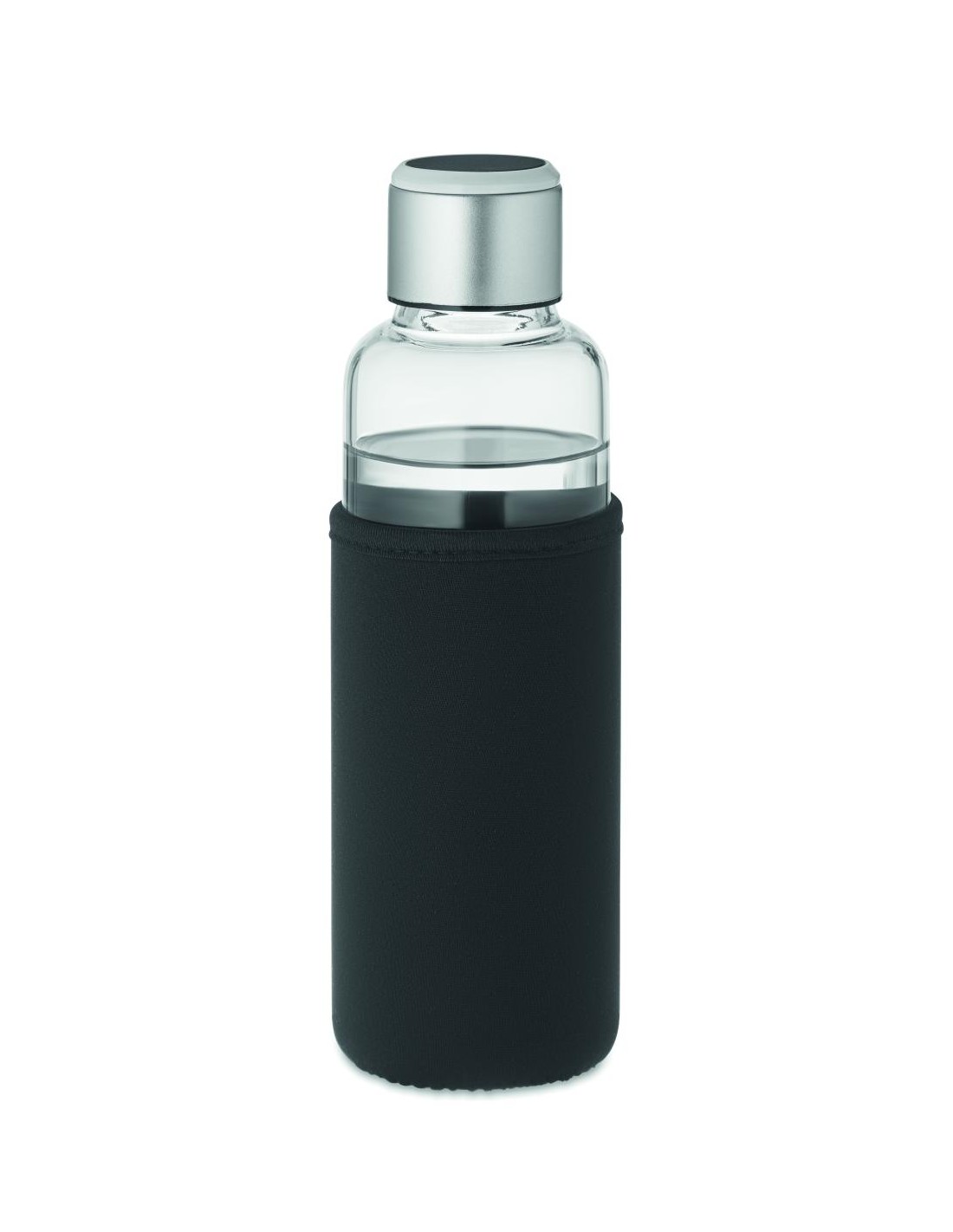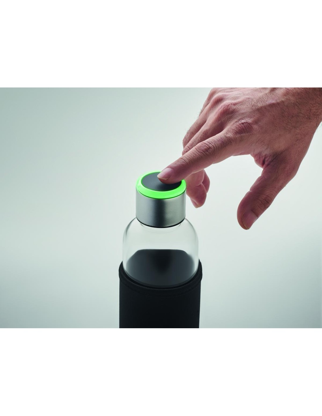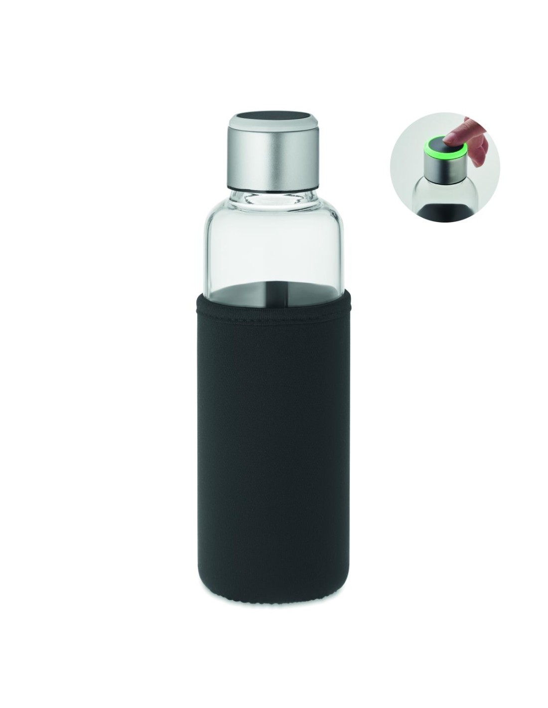 Botella de vidrio borosilicato con funda de neopreno y función recordatorio de hidratación en el tapón. La luz se enciende cada hora para recordarte que es hora de beber. Incluye 1 pila CR2032. Capacidad: 500 ml.