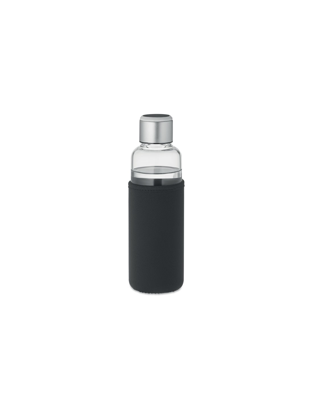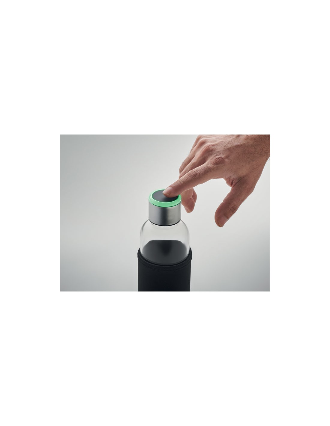Botella de vidrio borosilicato con funda de neopreno y función recordatorio de hidratación en el tapón...