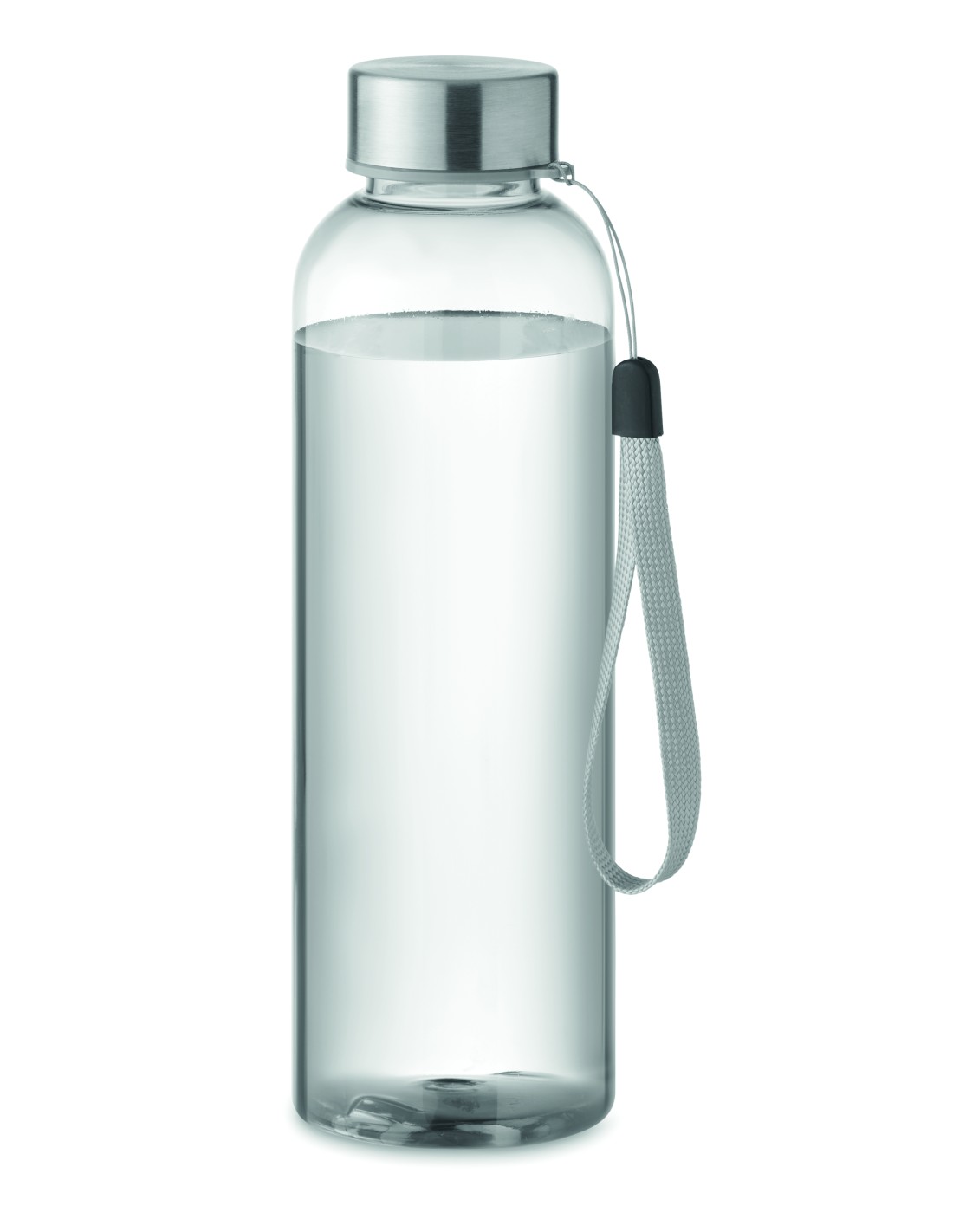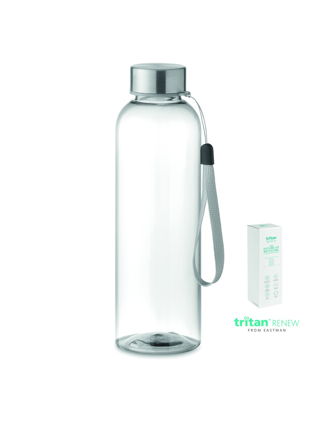 Botella en Tritan Renew™ libre de BPA con tapa con asa de acero inoxidable. Anti fugas. Capacidad 500 ml. Este producto se obtiene a partir de un 50% de residuos plásticos usando Certificación de Sostenibilidad en Materias Primas Renovables (ISCC)