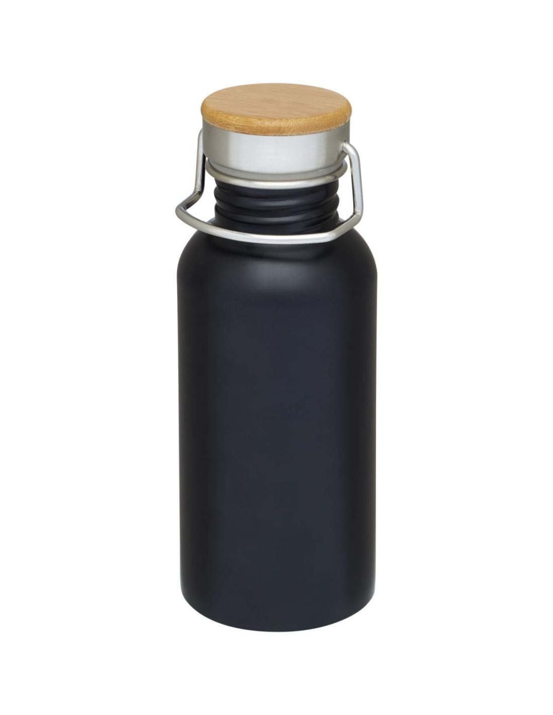 Botella de acero inoxidable de una sola pared con tapa de rosca. La parte superior de la tapa es de bambú, y lleva un asa para facilitar el transporte. Capacidad de 550 ml. Se presenta en una caja de regalo \.