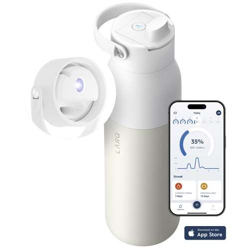 La botella de agua todo en uno de 680 ml tiene funciones de autolimpieza y filtrado de agua, así como seguimiento inteligente de la hidratación. Mejora la calidad del agua mediante un proceso de filtración en 2 etapas y purificación UV-C, lo que proporciona un agua más limpia y con mejor sabor. El LED UV-C del tapón se activa automáticamente cada dos horas para mantener la botella limpia y sin olores, pero también puedes iniciar de forma manual un ciclo PureVis™ con solo pulsar un botón. Con una batería de larga duración, la botella funciona hasta 2-3 semanas con una carga completa a través del puerto USB-C. El tapón incorpora un asa extraíble de tacto suave para transportarla cómodamente. Los sensores inteligentes realizan un seguimiento automático de la ingesta de agua, mientras que la aplicación LARQ proporciona información y progreso. Los filtros deben sustituirse periódicamente para obtener un rendimiento óptimo.