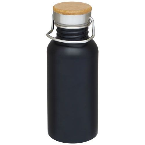 Botella de acero inoxidable de una sola pared con tapa de rosca. La parte superior de la tapa es de bambú, y lleva un asa para facilitar el transporte. Capacidad de 550 ml. Se presenta en una caja de regalo .