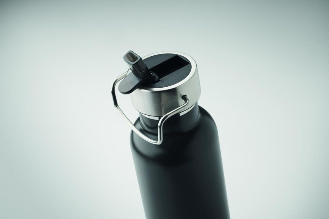 Botella aislante al vacío de doble pared de acero inoxidable reciclado (90% de acero inoxidable reciclado y 10% de acero inoxidable) con pajita incorporada y tapa con asa. Capacidad: 660 ml.