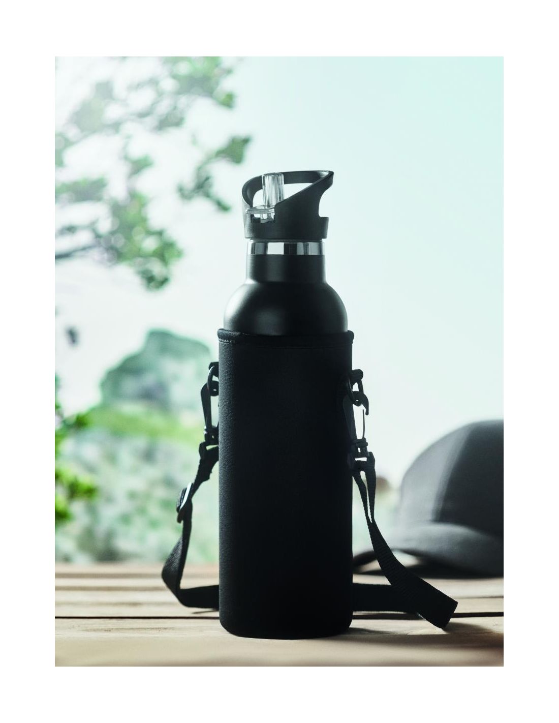 Botella de acero inoxidable de doble pared aislado al vacío con tapón de rosca anti fugas acabado de madera y tapón adicional con boquilla intercambiable. Se suministra con bolsa de transporte de neopreno. Capacidad: 700 ml.