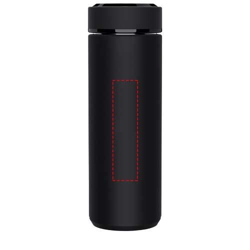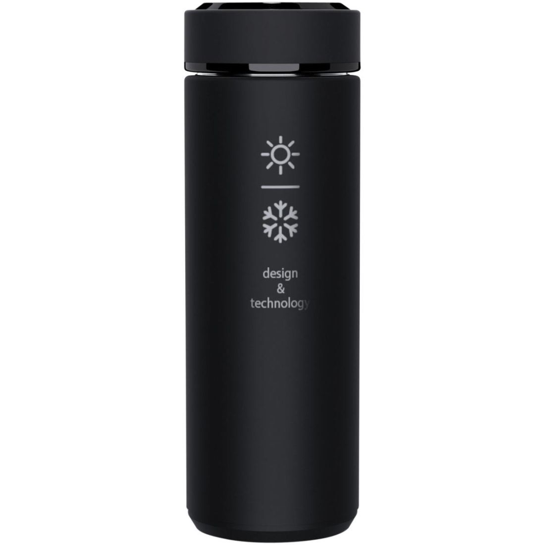 Botella de 450 ml de acero inoxidable con doble pared aislante y sensor de temperatura. Gracias al sistema «Touch & Light», la temperatura de la bebida se muestra en la tapa de la botella (en ° Celsius). Adecuado tanto para bebidas calientes como frías. Viene en una caja cilíndrica de regalo fabricada con papel reciclado. Tamaño: Ø 47 × 225 mm. Batería incluida: CR 2450 (3 V). La batería no puede sustituirse. Puede mostrar la temperatura 20 000 veces.