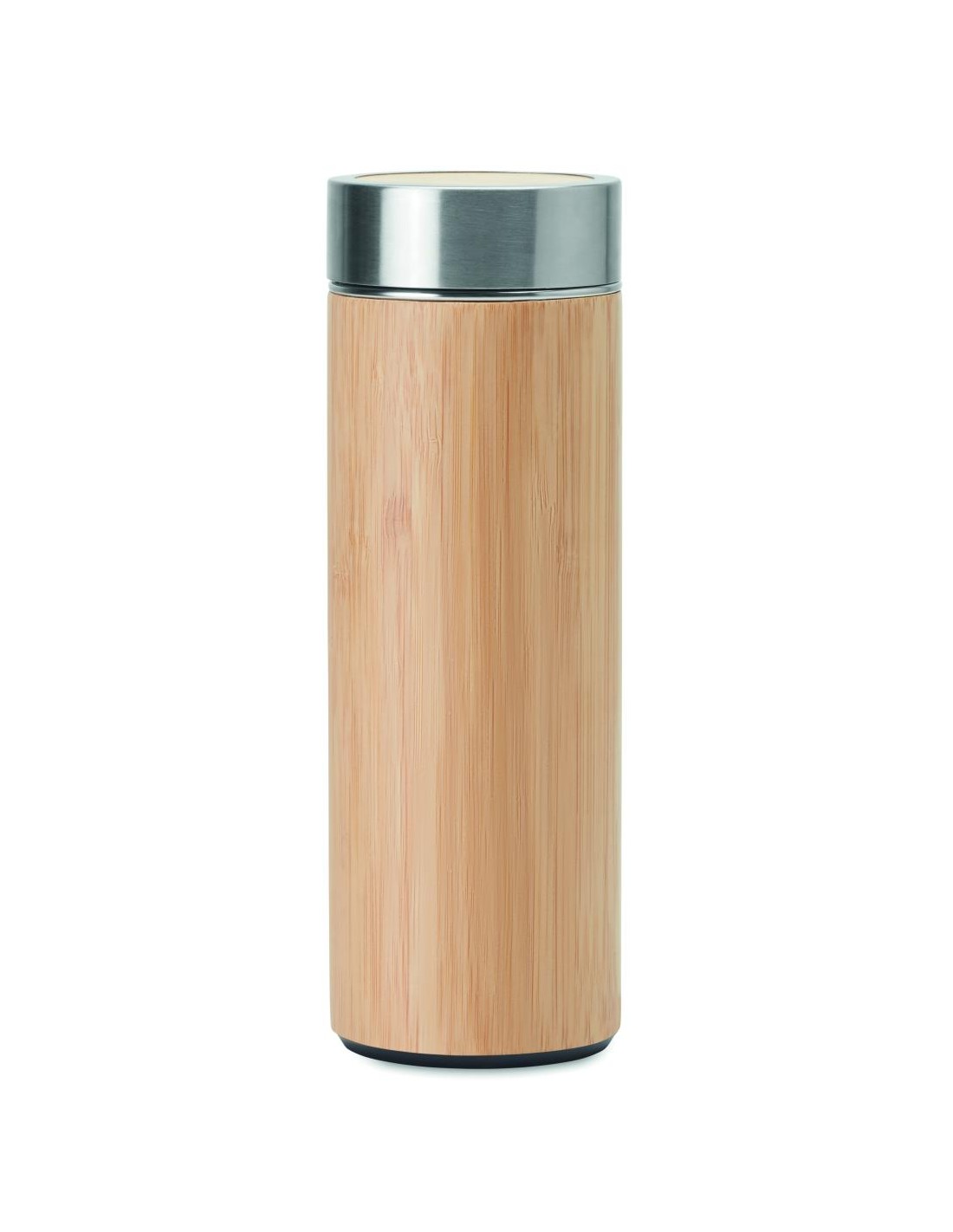 Termo de acero inoxidable de doble capa con carcasa y tapa de bambú e infusor de té. Capacidad: 400 ml. Como el bambú es un material natural, el color por artículo puede variar. FSC®-certified | FSC 100%, N5.7, FSC-C213206