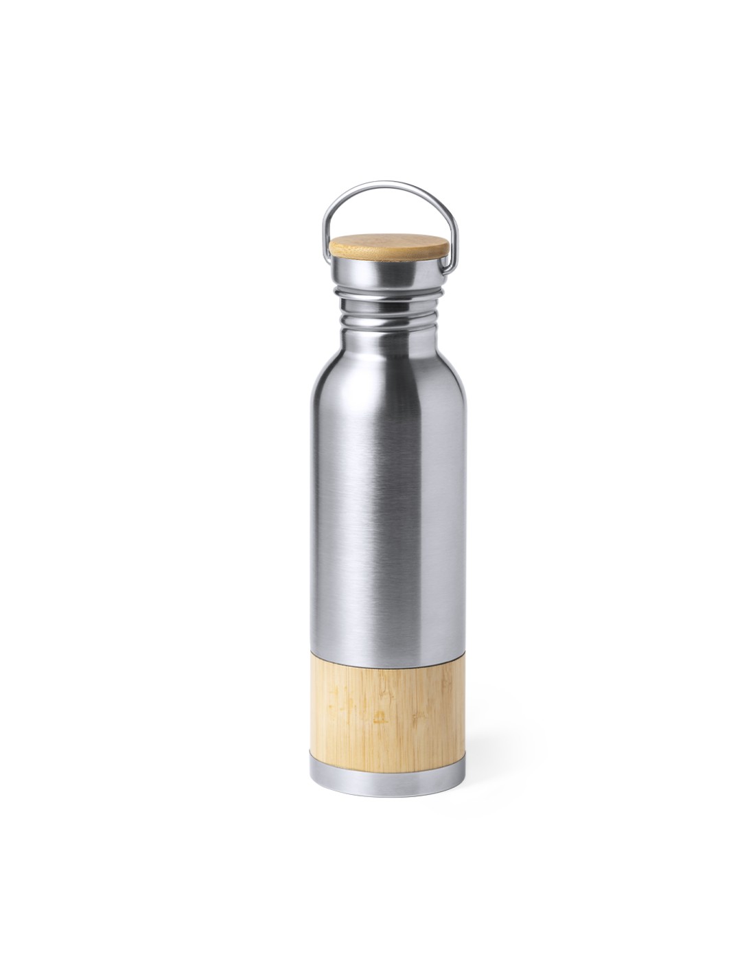 Bidón de original estilo retro y 800 ml de capacidad. Cuerpo en acero inox con franja de bambú, con tapón de seguridad a rosca en acero inox y detalle en bambú. Presentado en caja individual de diseño eco en cartón kraft.