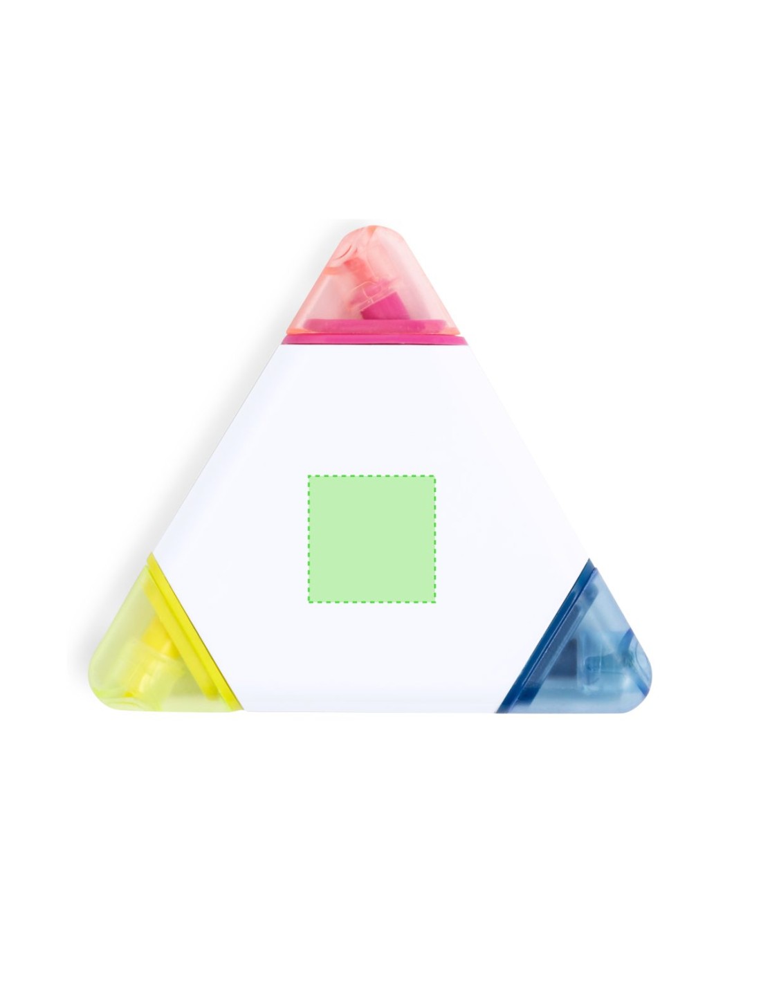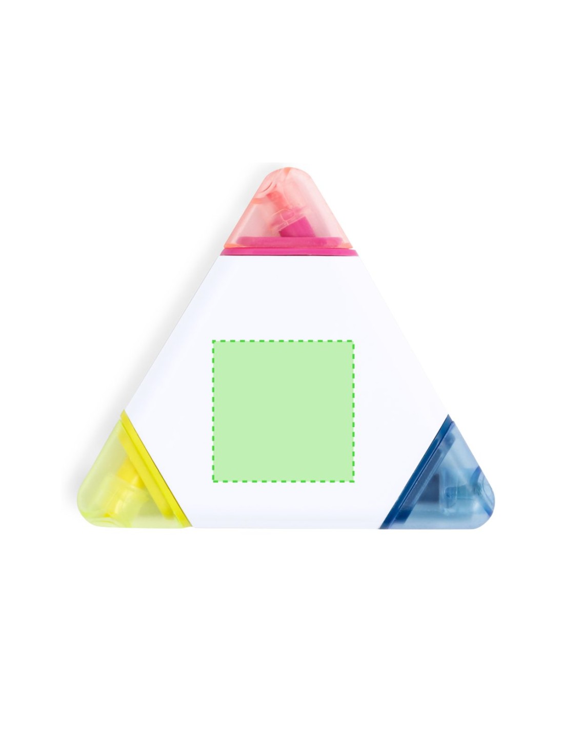Original marcador fluorescente de tres colores con cuerpo triangular en suave acabado brillante de color blanco, especialmente diseñado para marcaje digital a todo color. Con capuchas translúcidas juego con marcador.