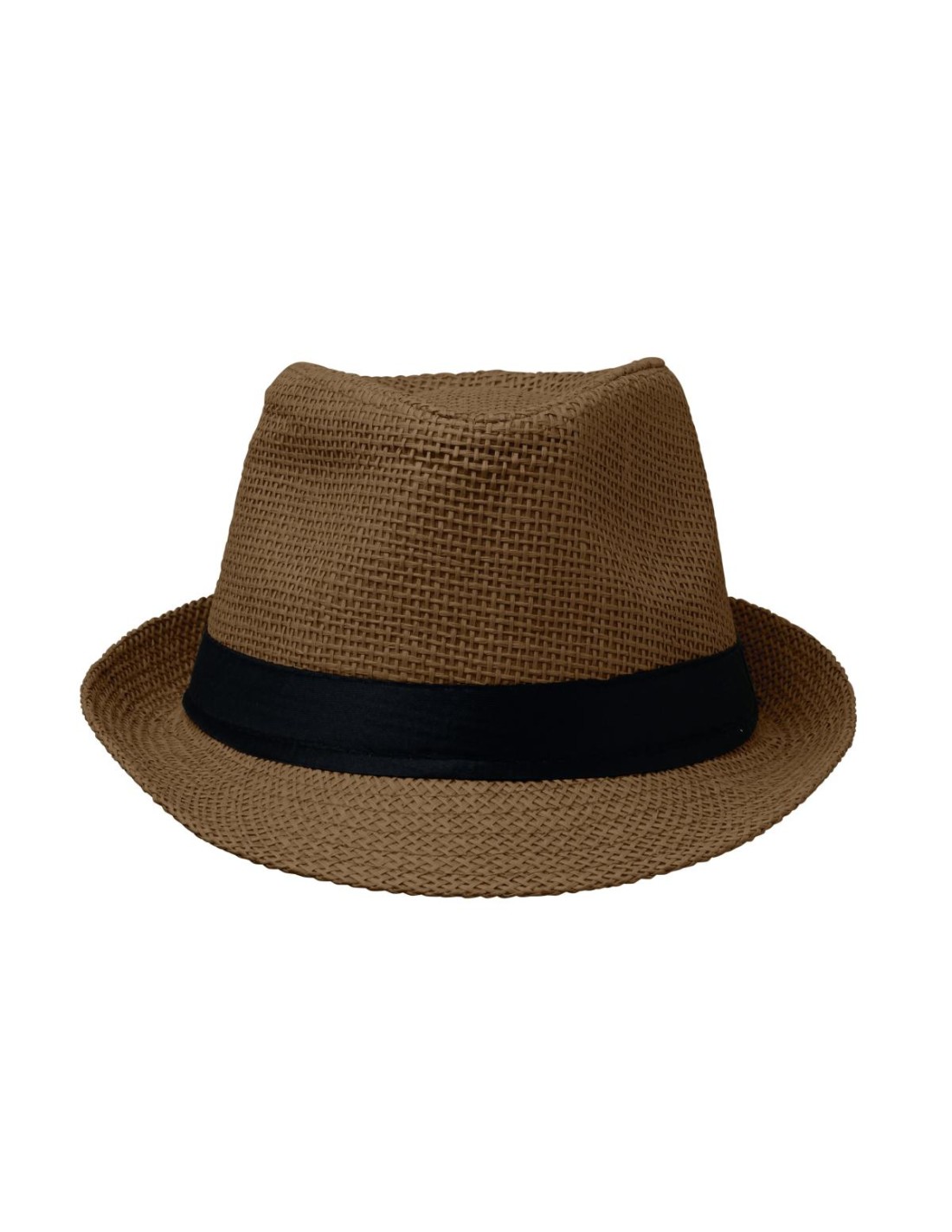 Sombrero de paja de papel con banda de poliéster negra. En los pedidos sin impresión, la cinta se servirá suelta y separada del sombrero.