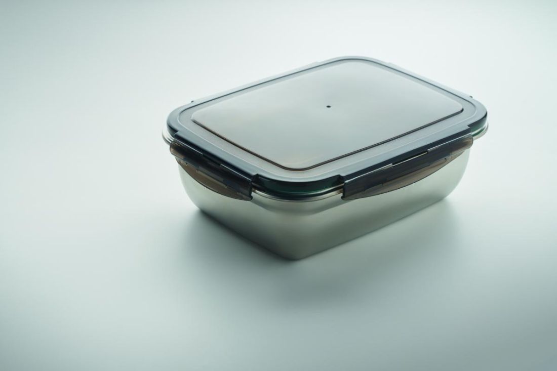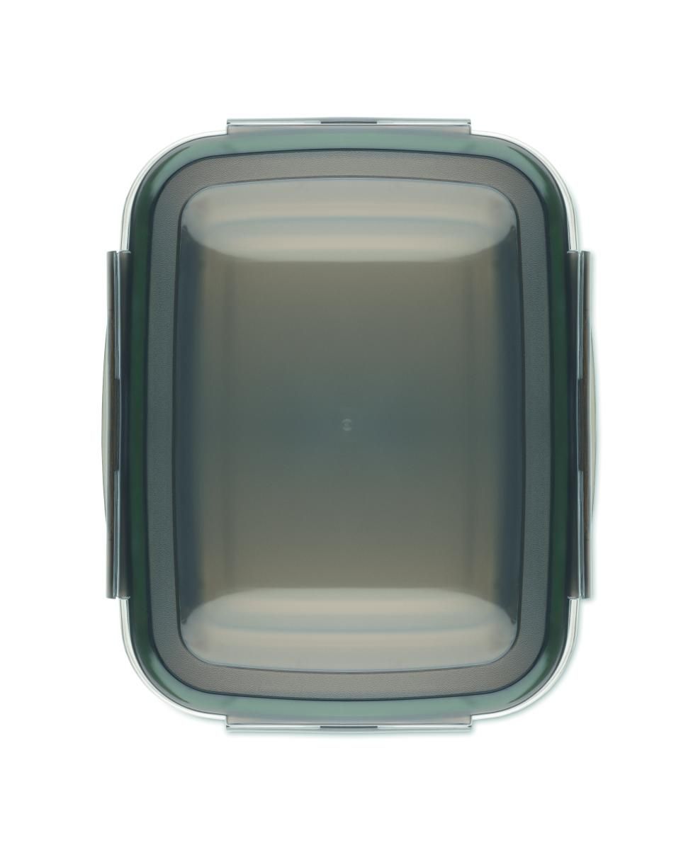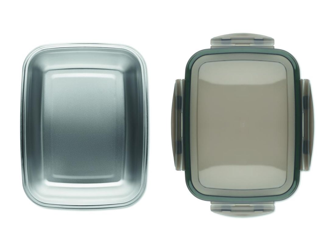 Fiambrera de acero inoxidable reciclado con tapa de PP y 4 cierre laterales. Incluye separador. Capacidad: 1500 ml.