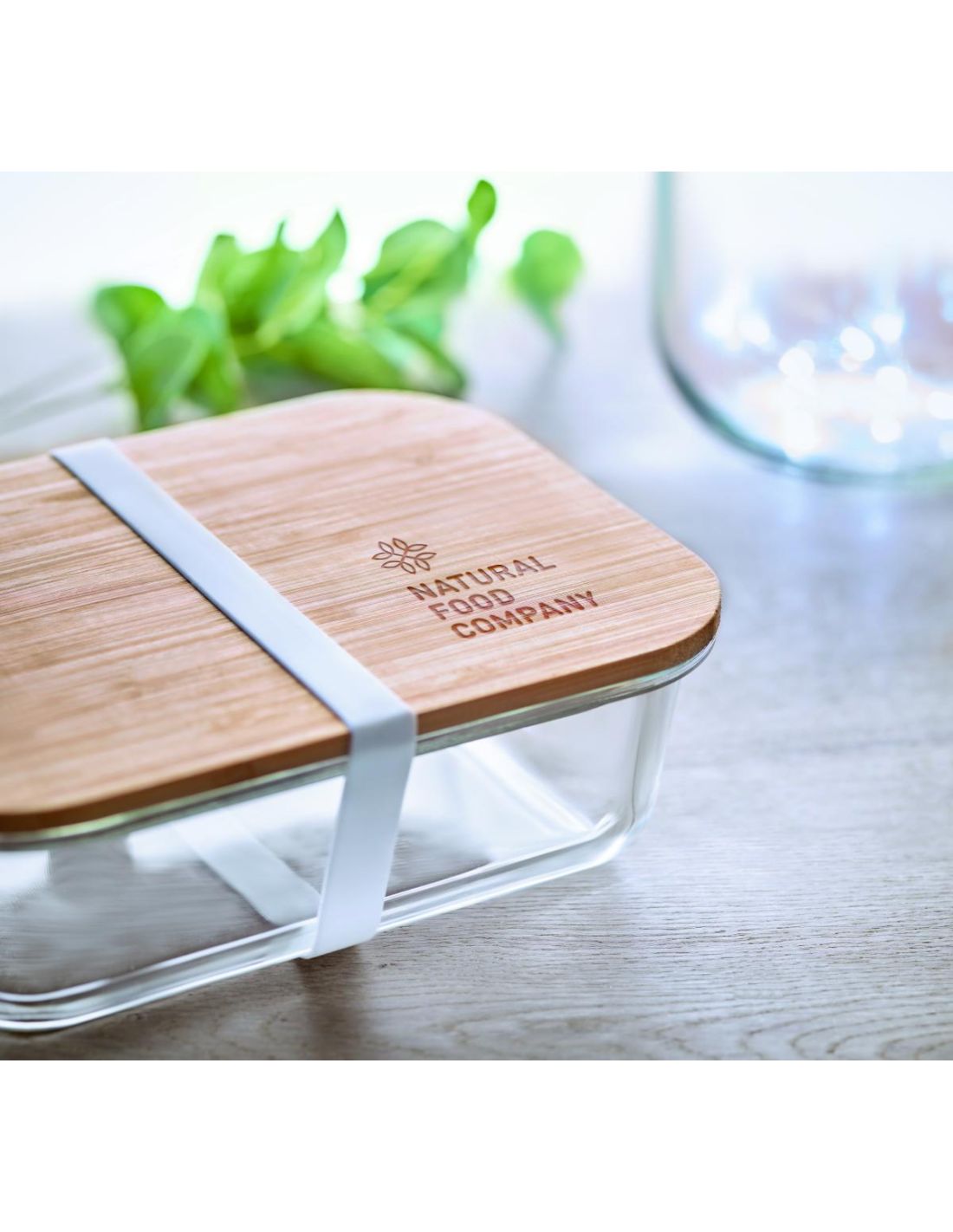 Fiambrera en vidrio con tapa de bambú y banda de silicona. Capacidad 800 ml. El bambú es un producto natural, puede haber ligeras variaciones en el color y el tamaño por artículo, lo que puede afectar el resultado final de la impresión.