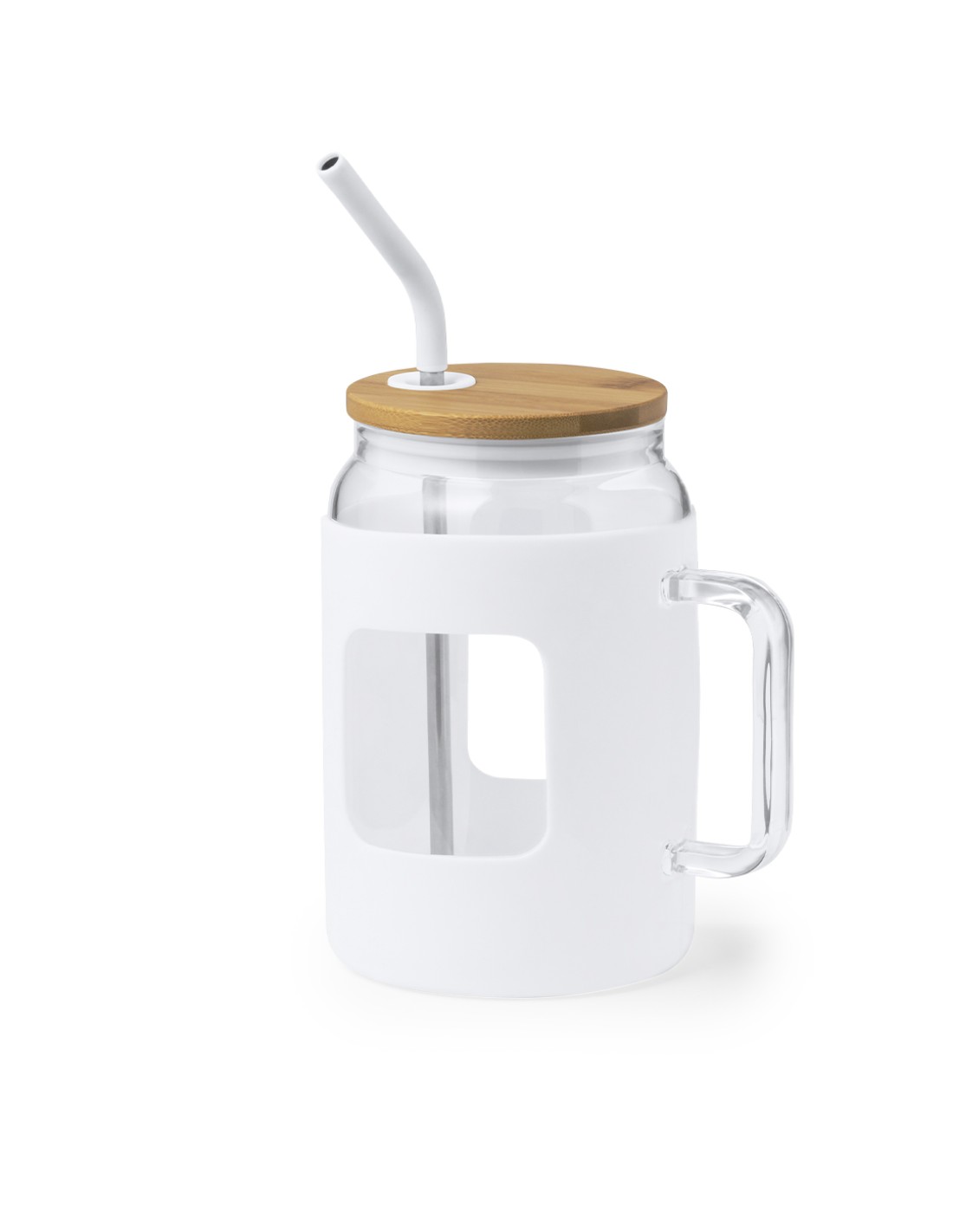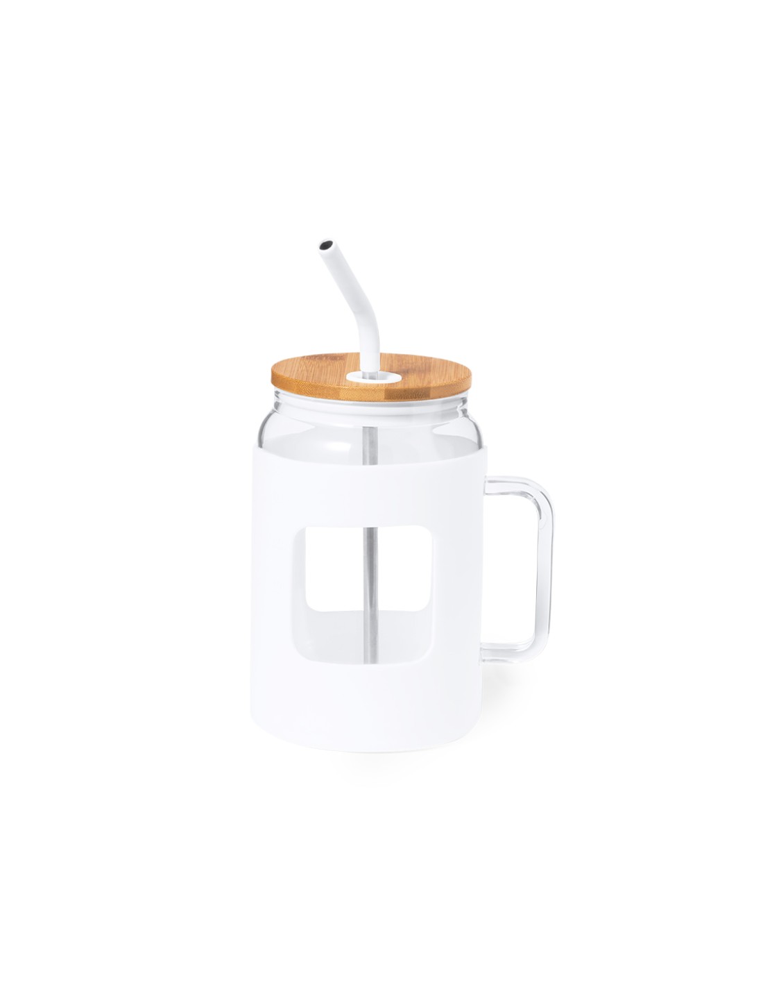 Tarro de gran capacidad (1,625 l) con cuerpo fabricado en resistente cristal, que ofrece una resistencia y durabilidad excepcionales, alargando su vida útil y pudiendo ser reutilizado infinidad de veces. Incluye asa para cómodo transporte y funda protectora en suave silicona. Tapa en bambú a presión, con orificio para pajita, y pajita reutilizable de acero inoxidable, con la punta recubierta en silicona para disfrutar de las bebidas de manera cómoda y segura.Presentado en caja individual de diseño kraft.