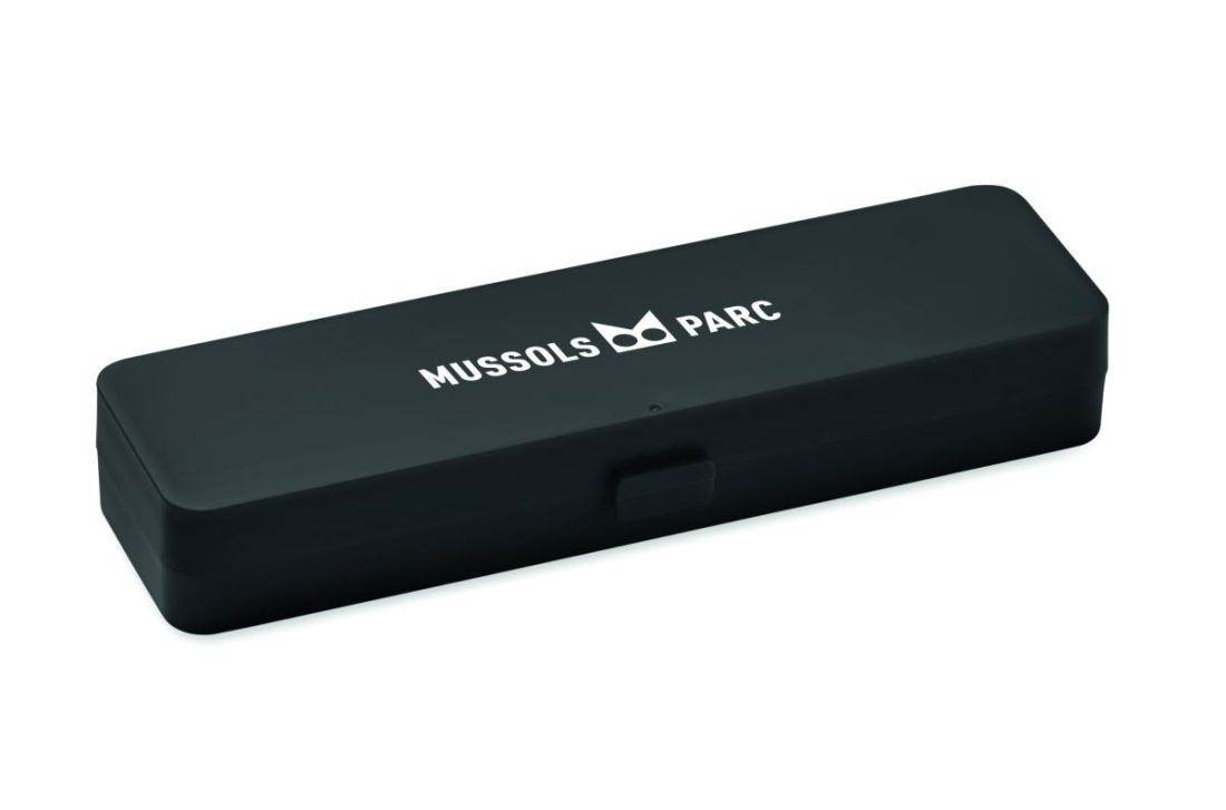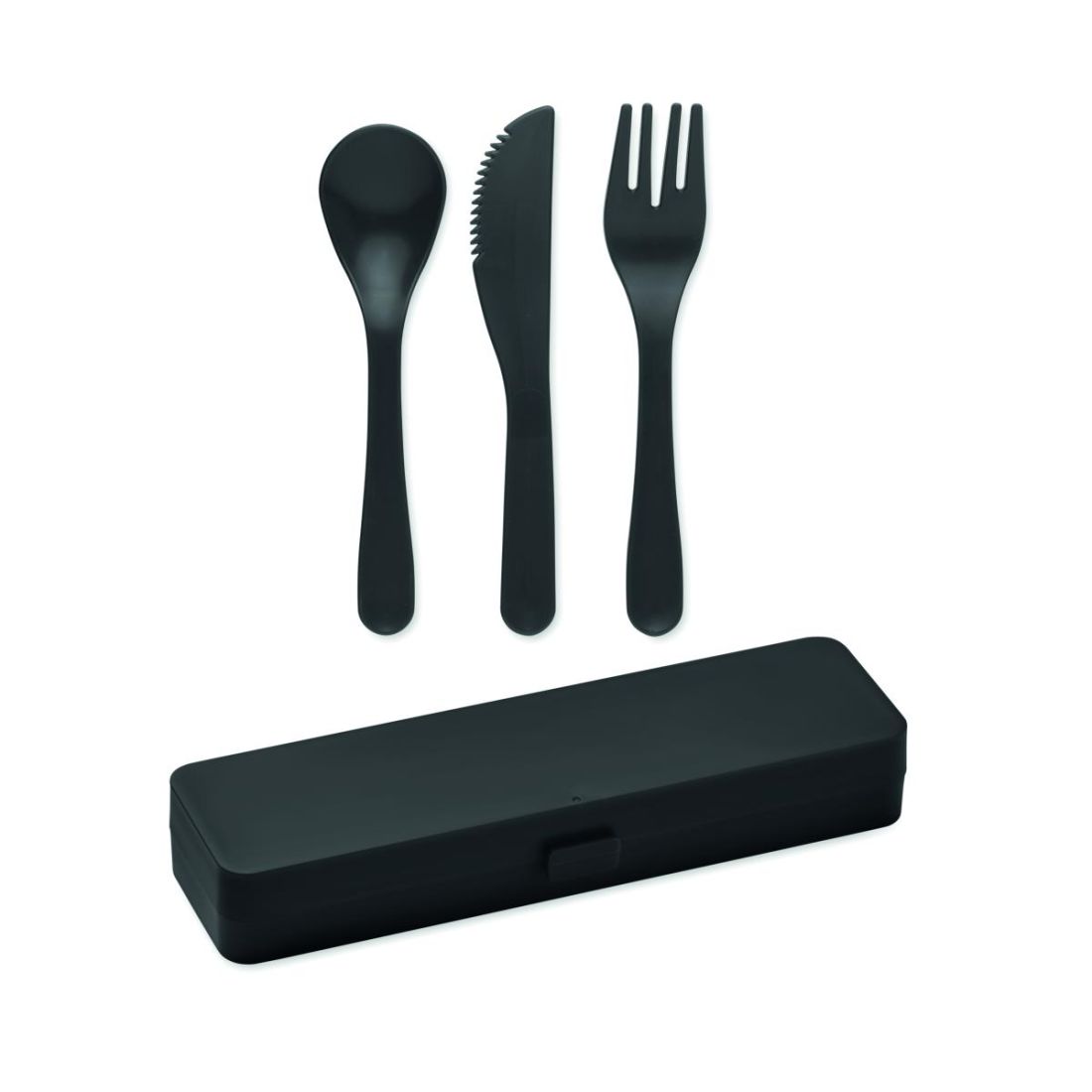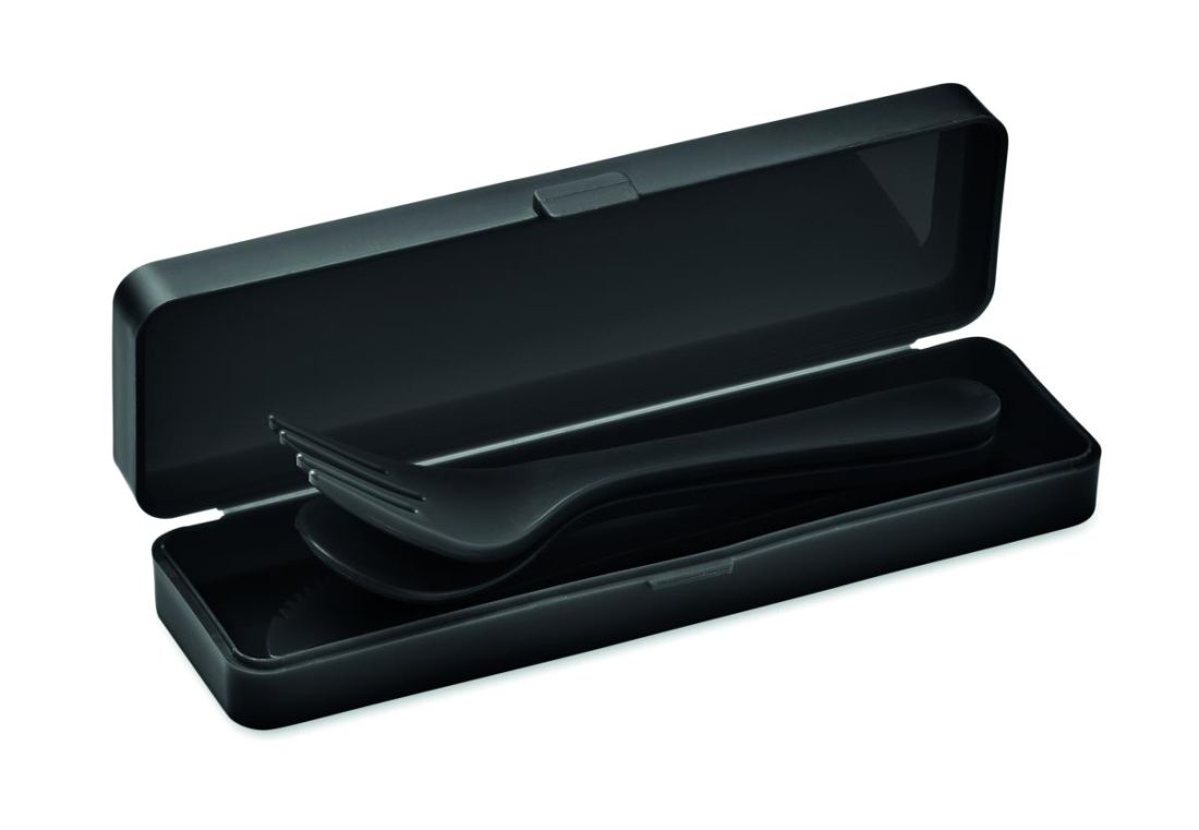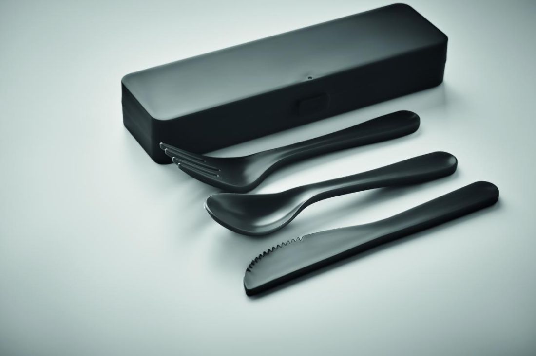 Set de cubiertos en PP reutilizables y en estuche. Incluye cuchara, tenedor y cuchillo.