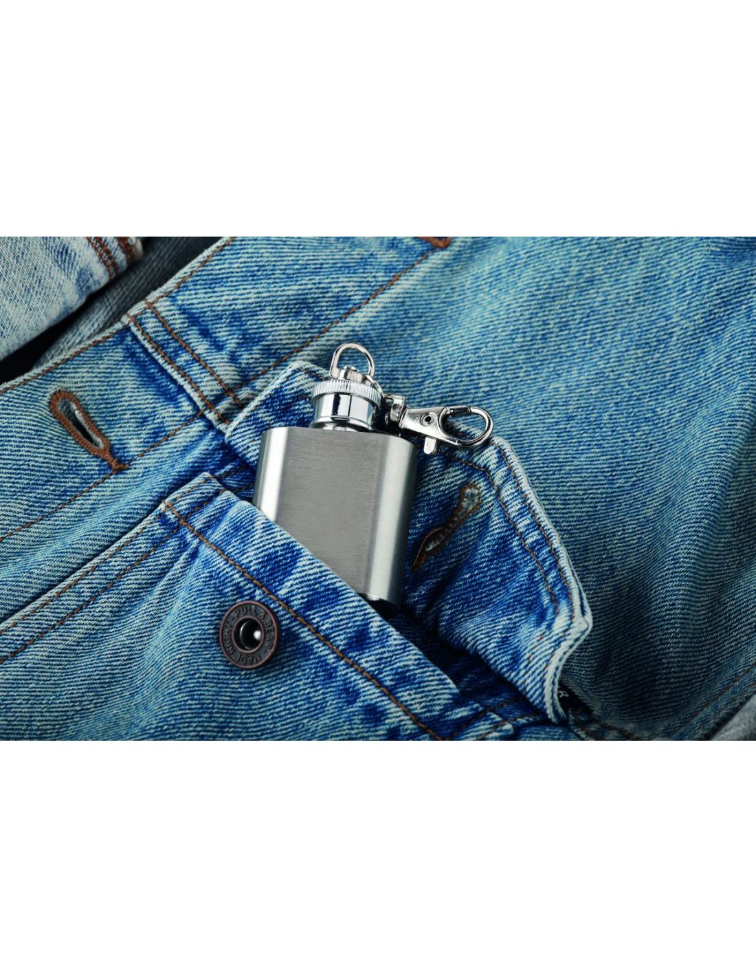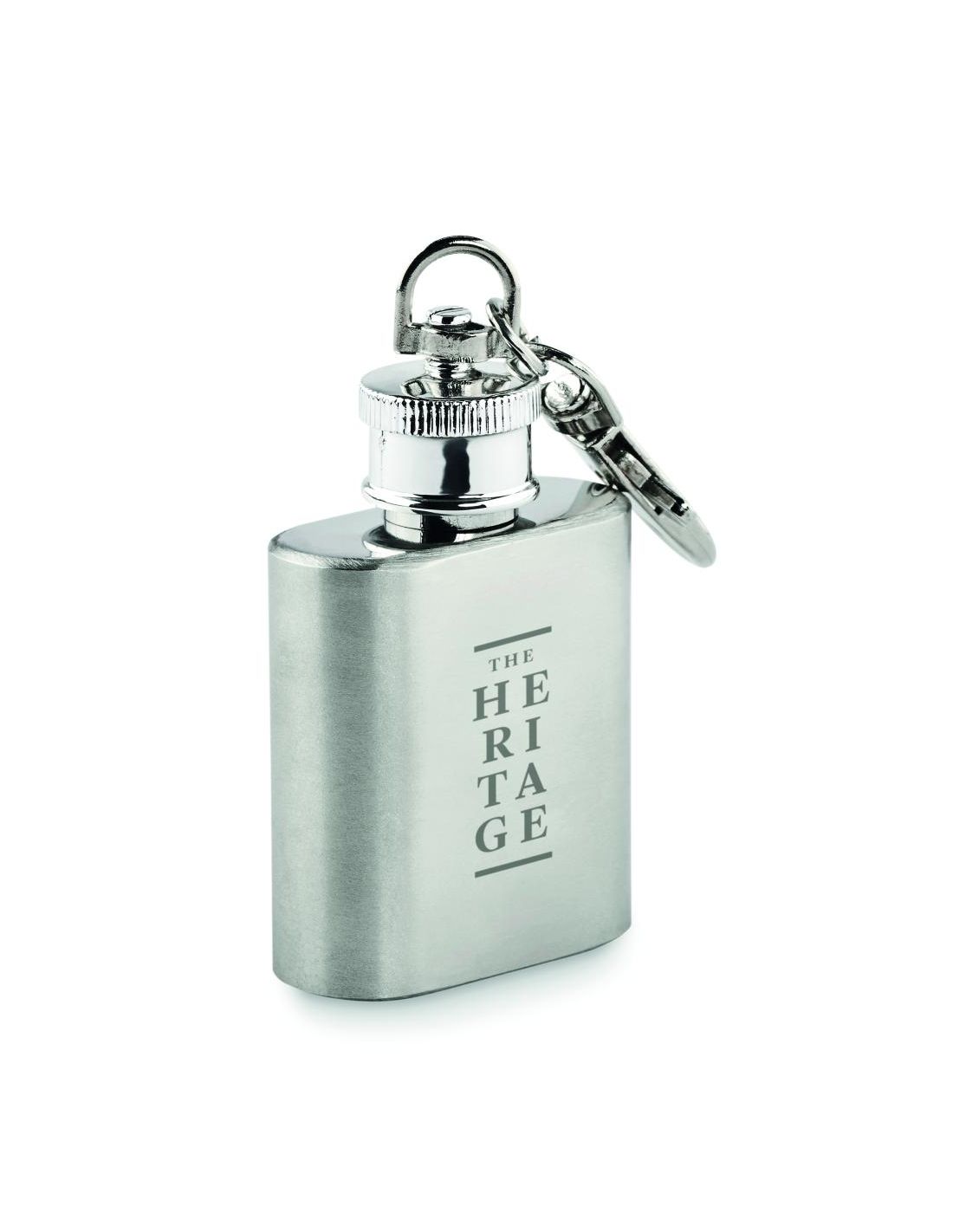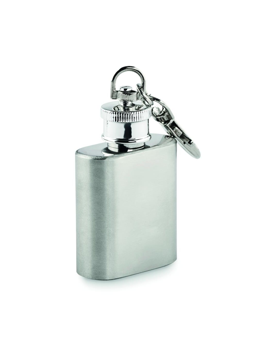 Llavero petaca de acero inoxidable. Capacidad: 28 ml.