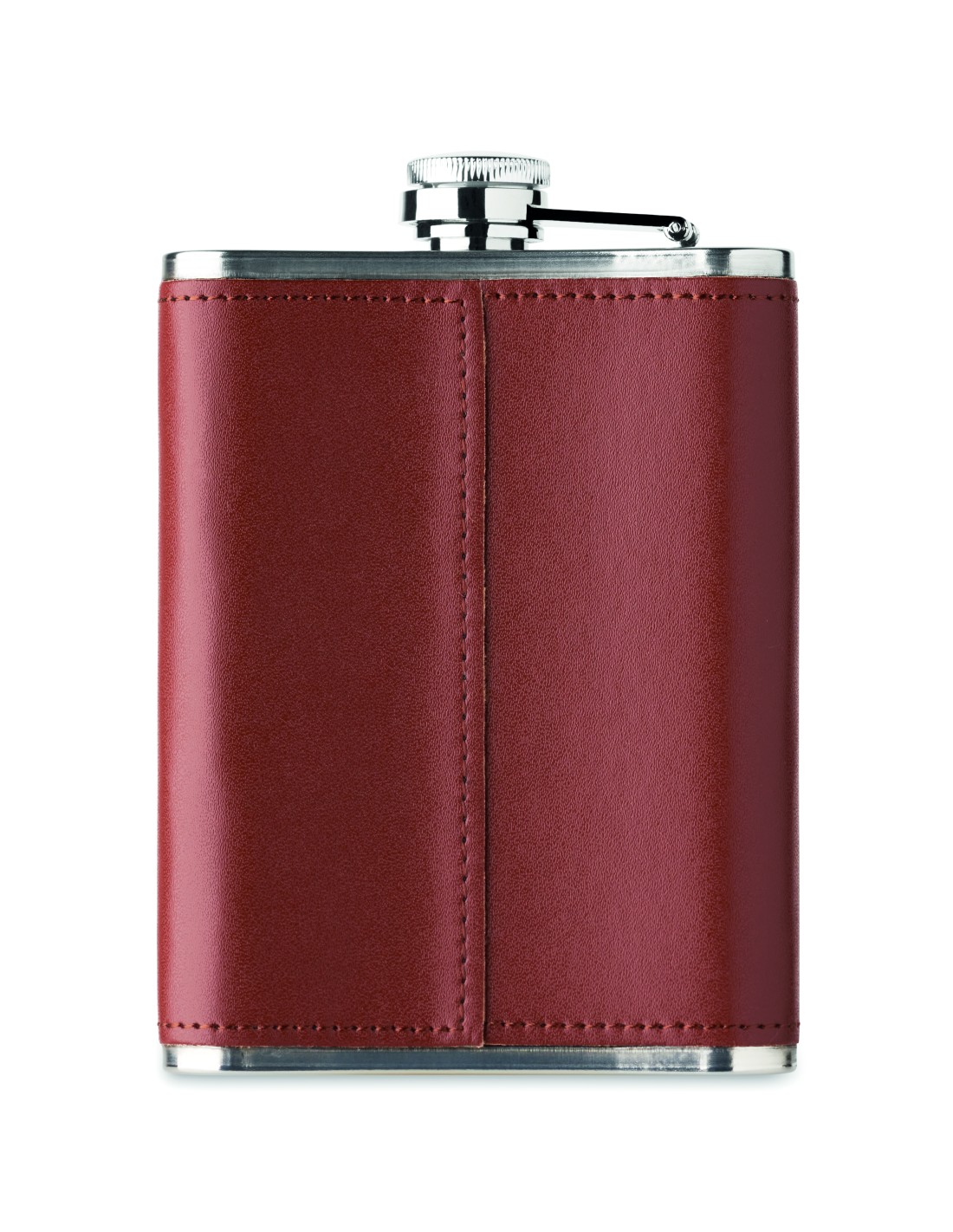 Petaca de acero inoxidable con tapa de cuero PU. Capacidad de 200 ml.