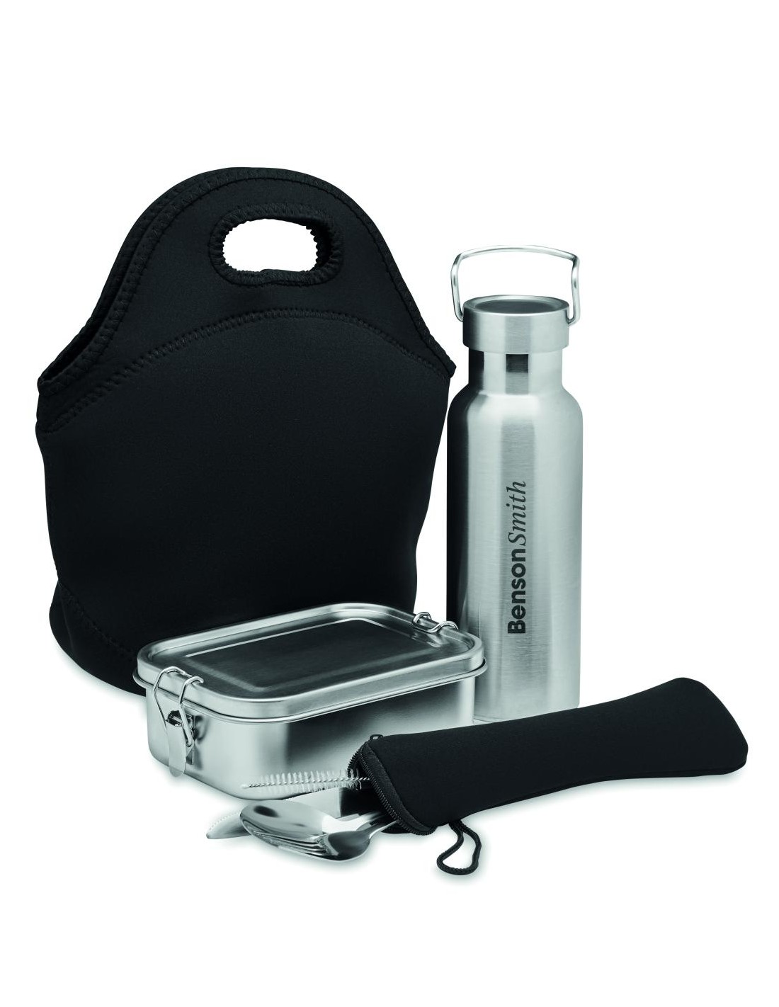 Set de utensilios para llevarte la comida donde quieras. Todo en bolsa de neopreno. Incluye botella acero inox. doble pared (500 ml) , fiambrera (600 ml) y cubiertos en bolsa de neopreno y cremallera.