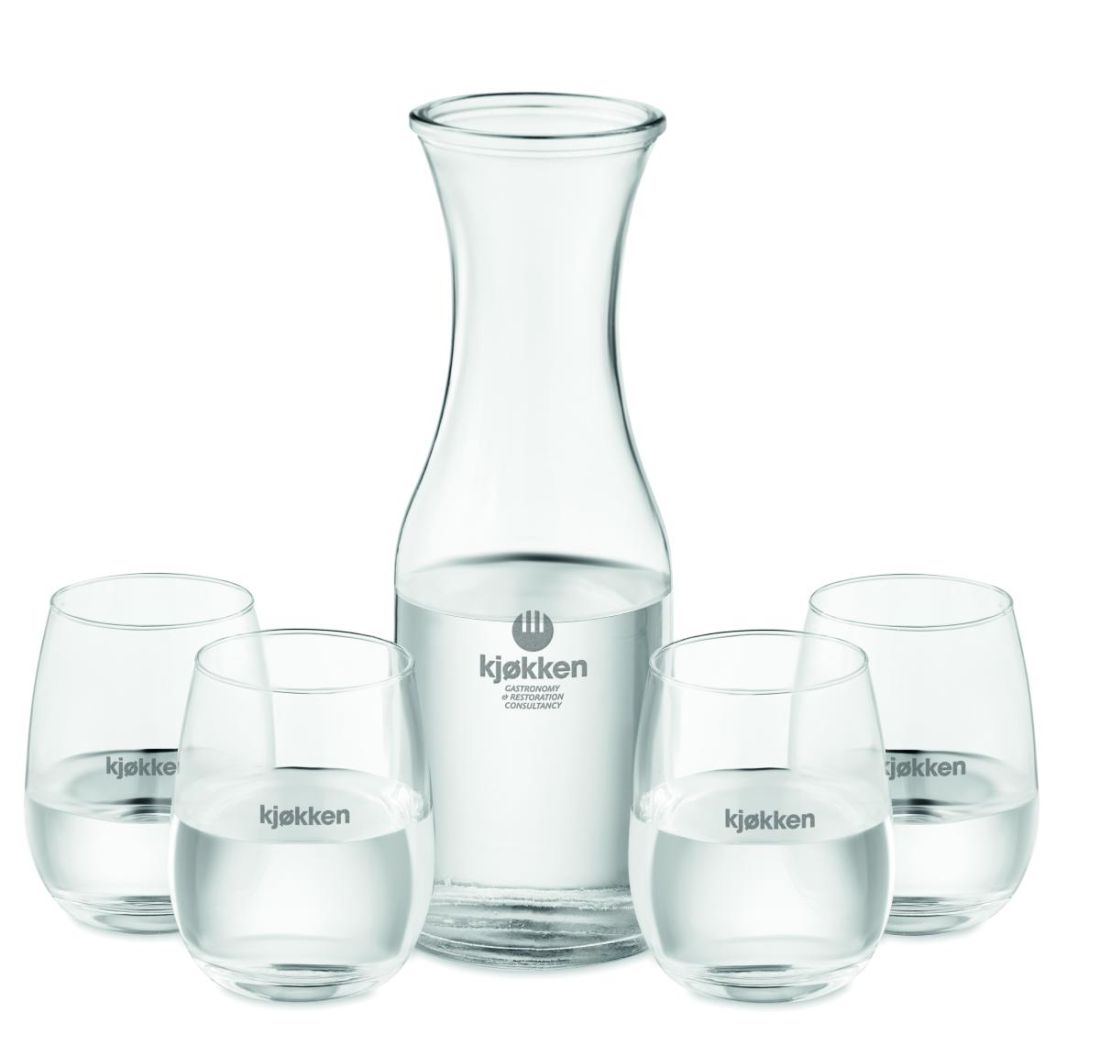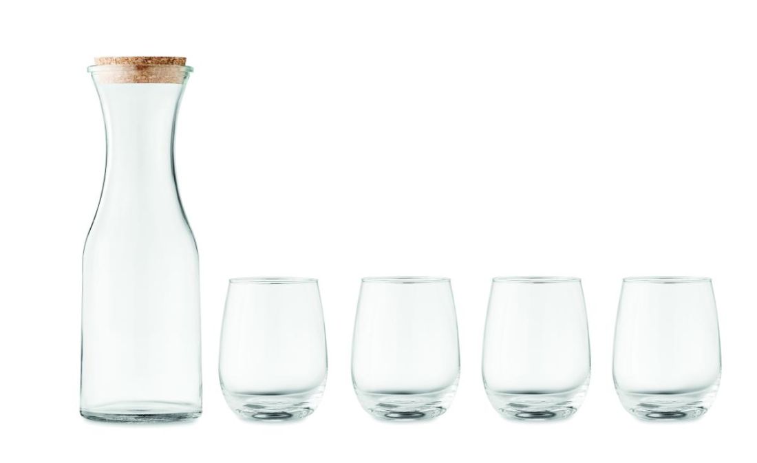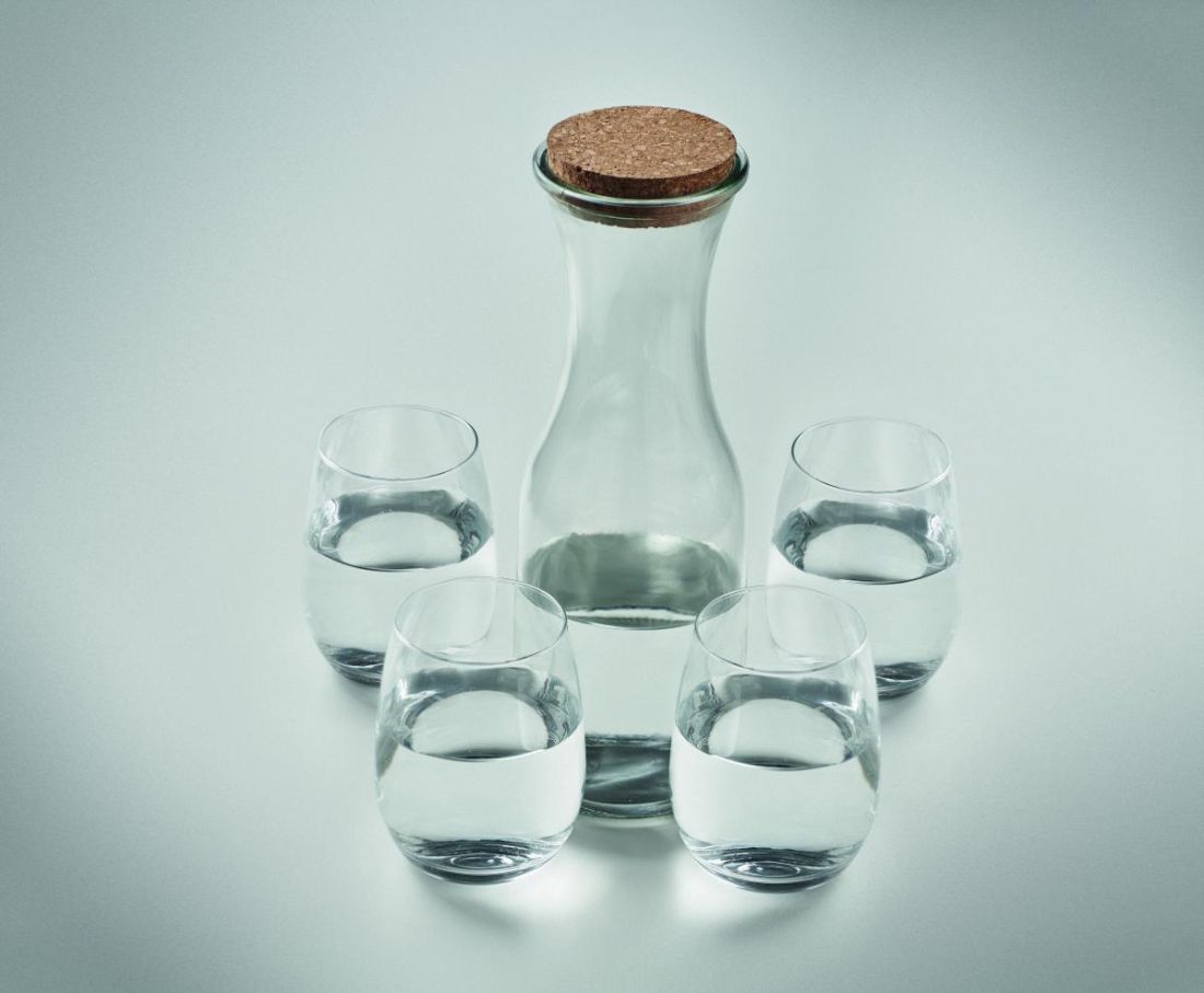 Set de vasos de vidrio reciclado. Incluye: Jarra (1L) con tapa de corcho y 4 vasos (420 ml). El corcho es un material natural, debido a su naturaleza estructural y porosidad superficial, el resultado final de la impresión por artículo puede tener desviaciones.