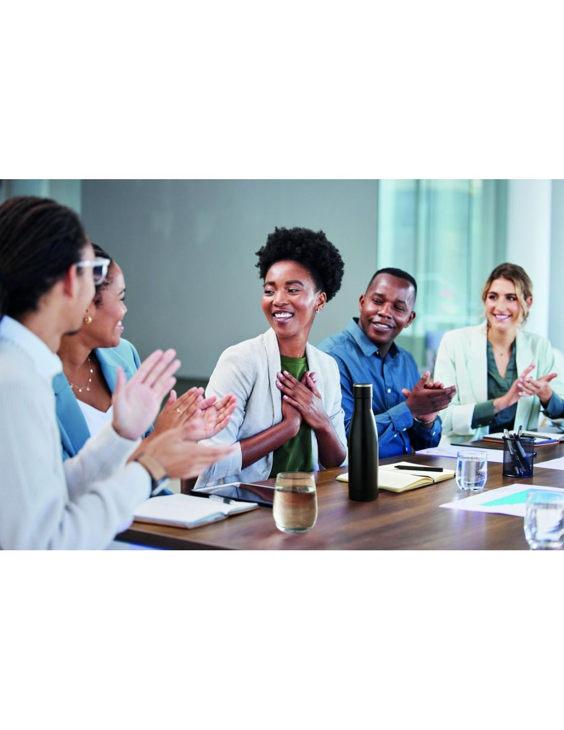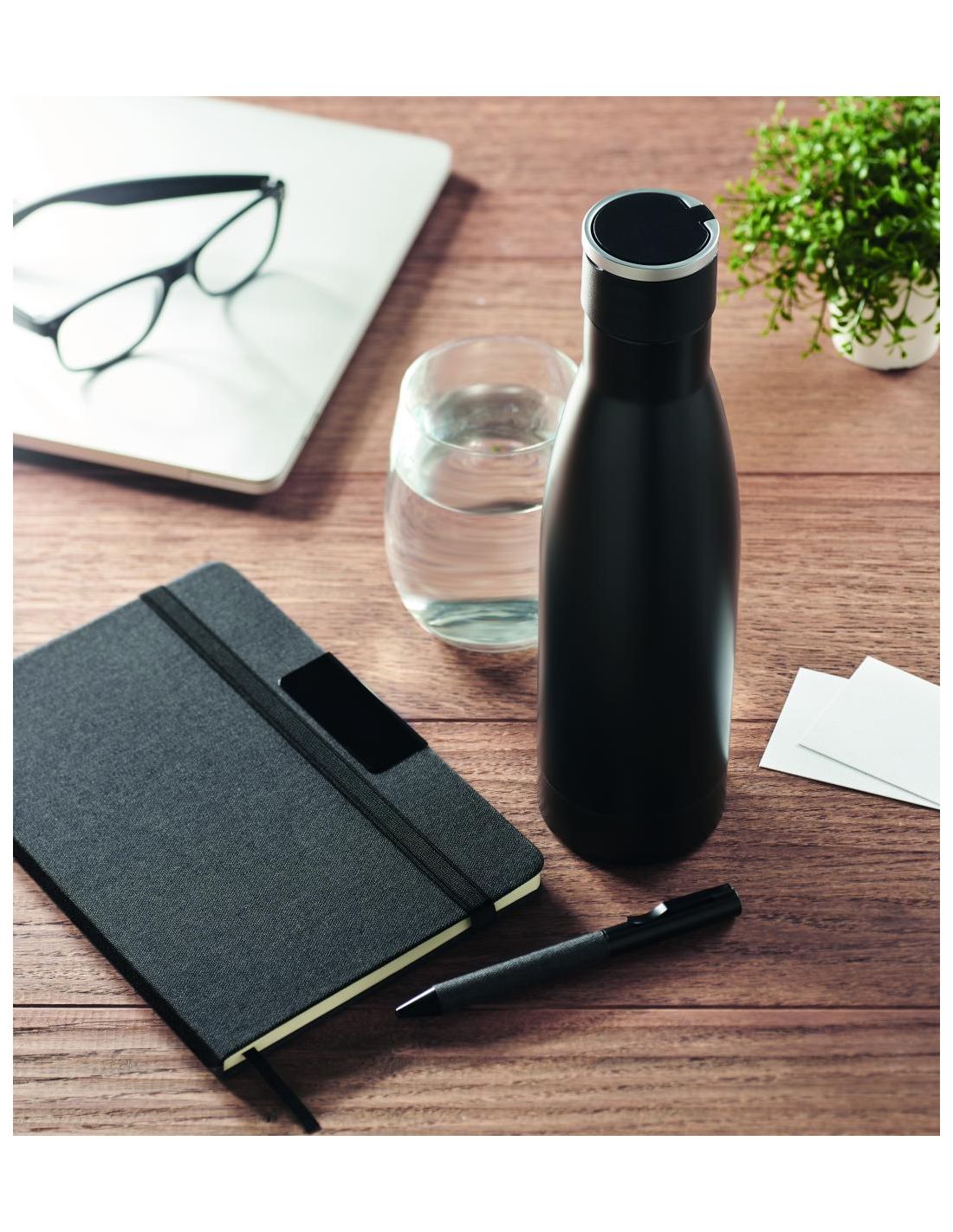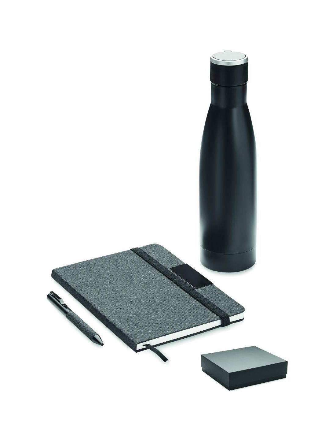 Set de regalo de 3 piezas. Incluye libreta A5 con tapa dura de RPET de 160 páginas de papel reciclado rayado (80 hojas). Banda elástica a juego, marcapáginas y portabolígrafos. Bolígrafo giratorio a juego. Botella de doble pared de acero 500 ml inoxidable con aislamiento al vacío. Presentado en caja de regalo. FSC®-certified | FSC MIX CREDIT, P7.1, FSC-C213206