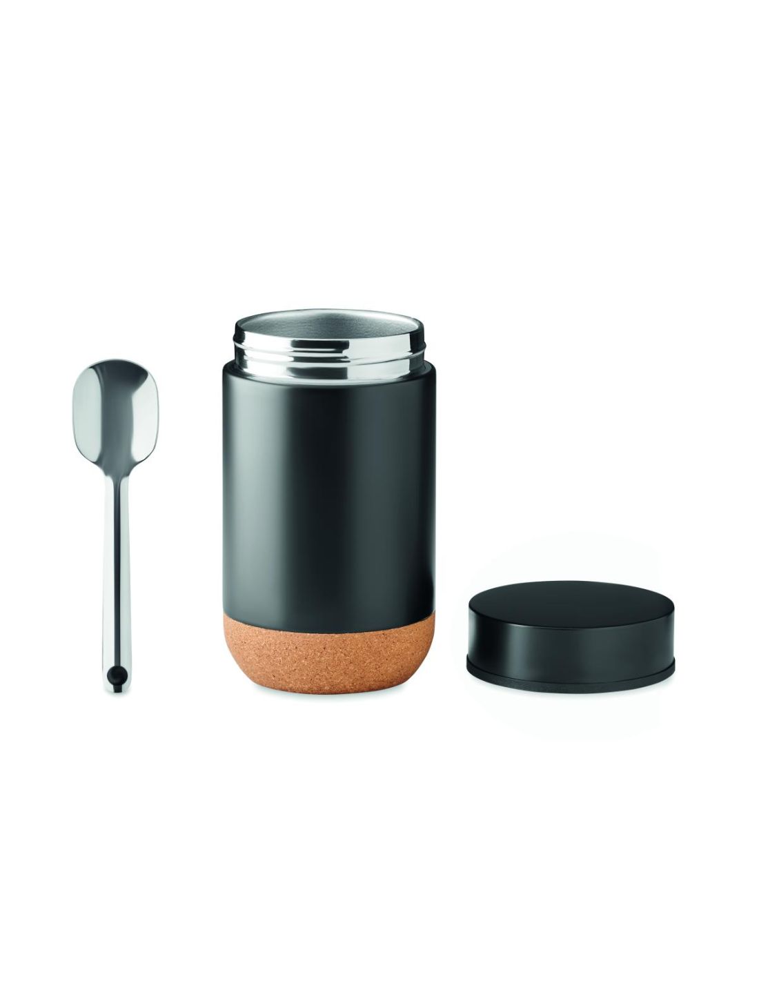 Tarro de doble pared de acero inoxidable con tapa de rosca y detalle de base de corcho. Incluye cuchara. Capacidad: 400 ml. El corcho es un material natural, debido a su naturaleza estructural y porosidad superficial, el resultado final de la impresión por artículo puede tener desviaciones.