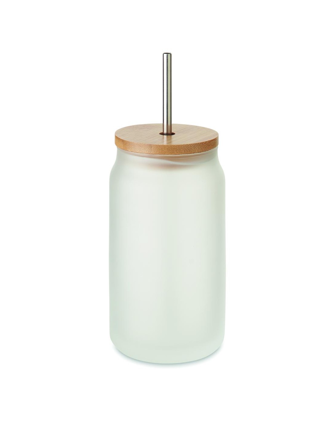 Tarro Mason para cócteles con revestimiento especial para sublimación y tapa de bambú. Incluye una pajita de acero inoxidable. Capacidad: 400 ml. E…