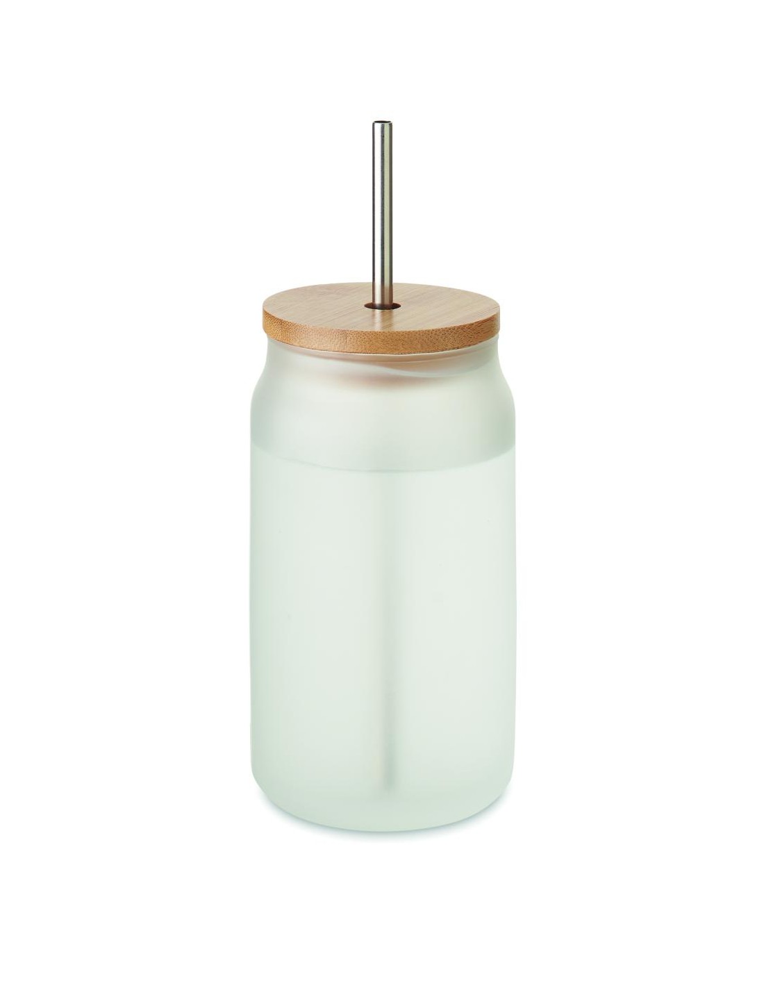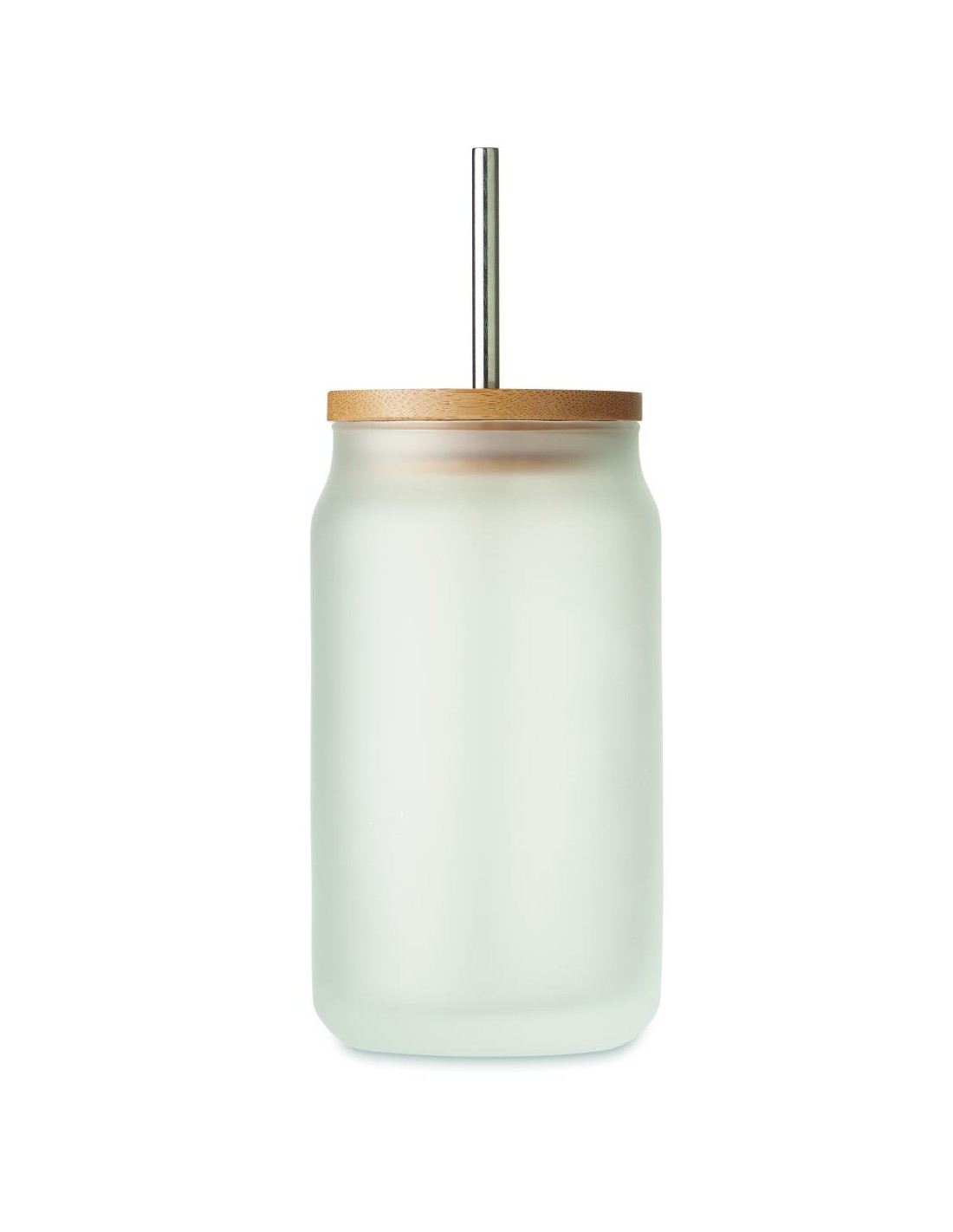 Tarro Mason para cócteles con revestimiento especial para sublimación y tapa de bambú. Incluye una pajita de acero inoxidable. Capacidad: 400 ml. El bambú es material natural, el color del articulo puede variar.