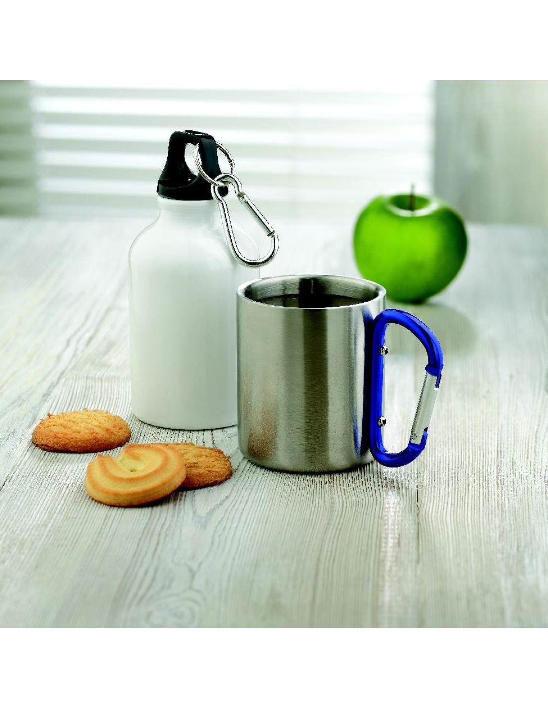 Taza de acero inoxidable de doble capa con asa de mosquetón. Capacidad: 220 ml.