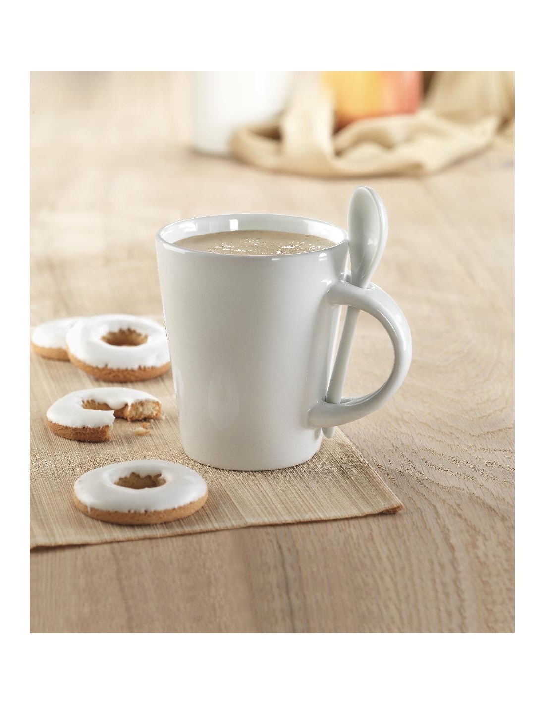 Taza de gres de 300 ml de capacidad con recubrimiento especial para impresión por sublimación. Incluye cuchara en el mango. Embalaje individual en caja de cartón blanca.