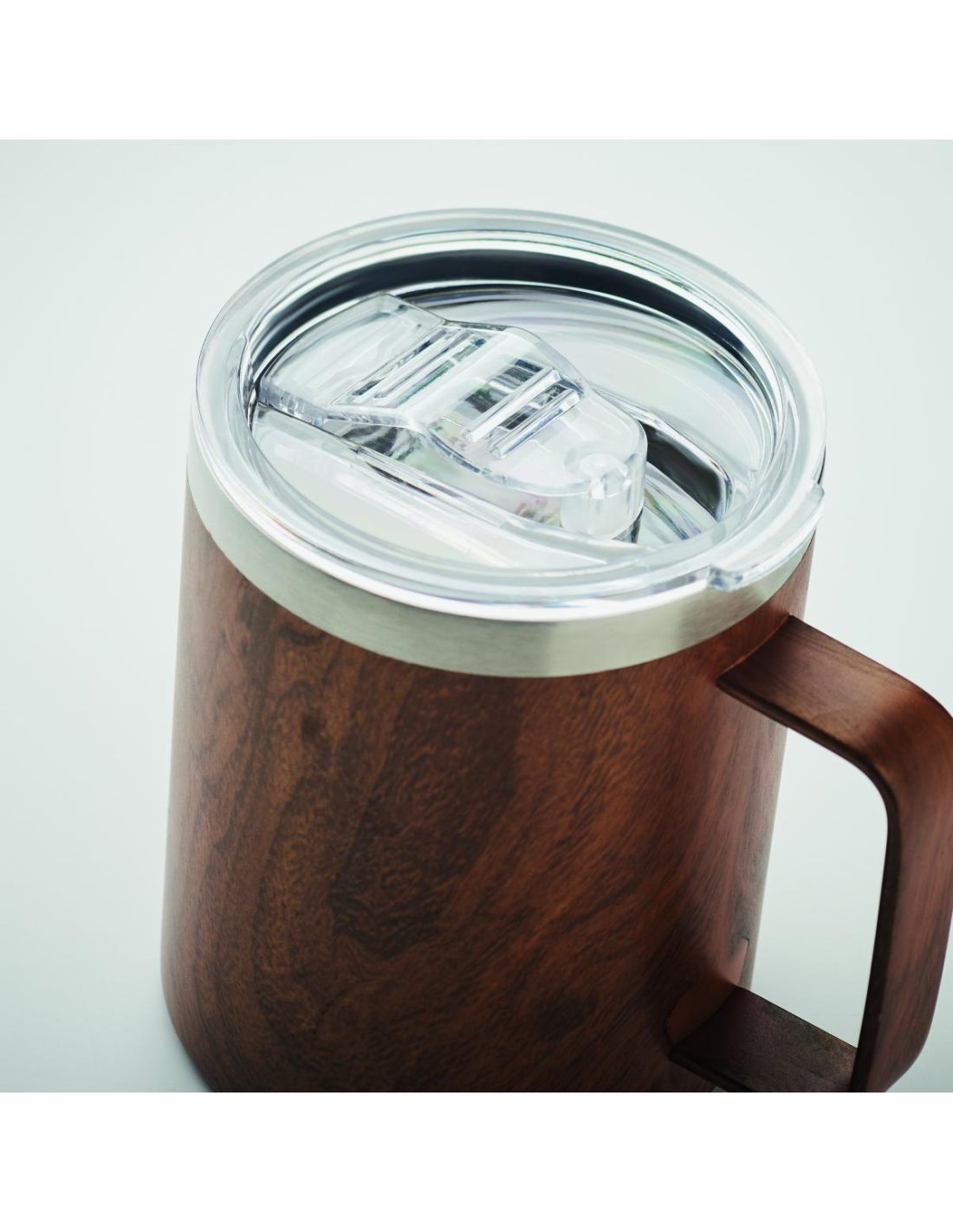 Taza de doble pared de acero inoxidable reciclado (90% acero inoxidable reciclado y 10% acero inoxidable) con aspecto de madera y tapa con orificio deslizante. Capacidad: 300 ml.