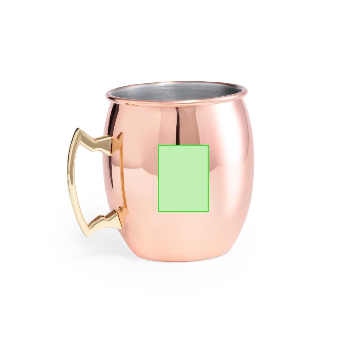 Taza de 500 ml de capacidad en acero inox con recubrimiento exterior de cobre galvanizado. Innovador diseño de asa y presentada en atractiva caja individual.