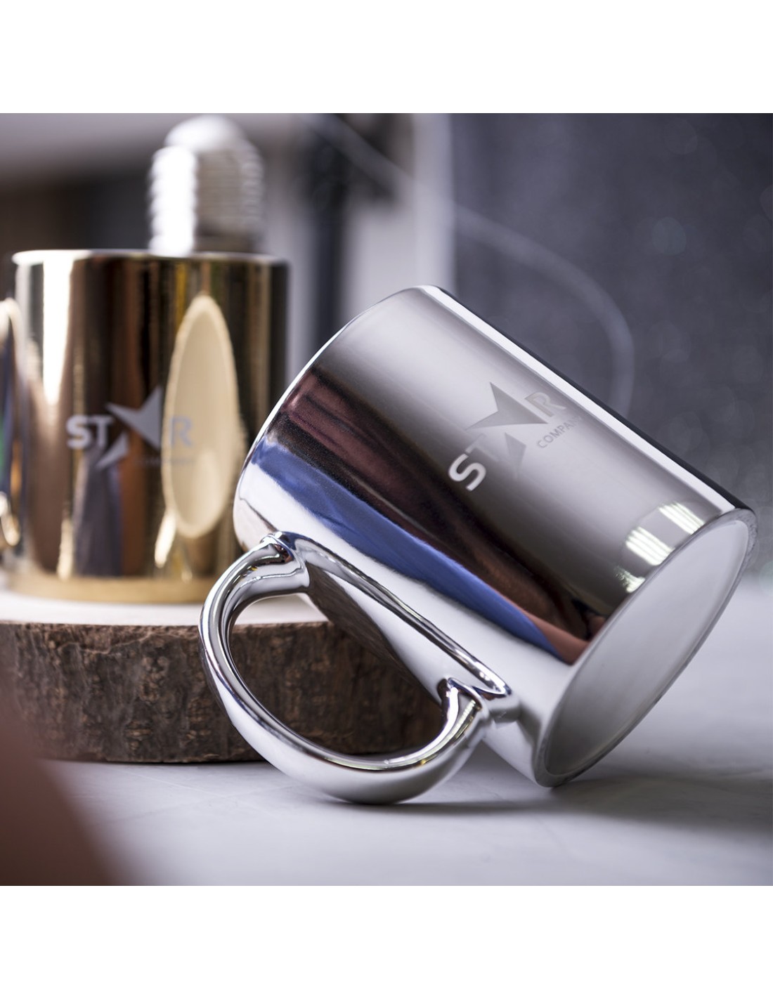 Taza de cerámica de 350ml de capacidad. Disponible en llamativos colores plateado y dorado brillantes. Especialmente diseñada para marcaje en láser, con un recubrimiento exterior metalizado especial para que tu publicidad quede perfectamente grabada en color blanco, a juego con el color interior de la taza. Presentada en caja individual. Se desaconseja su uso en el microondas debido al recubrimiento exterior metalizado.