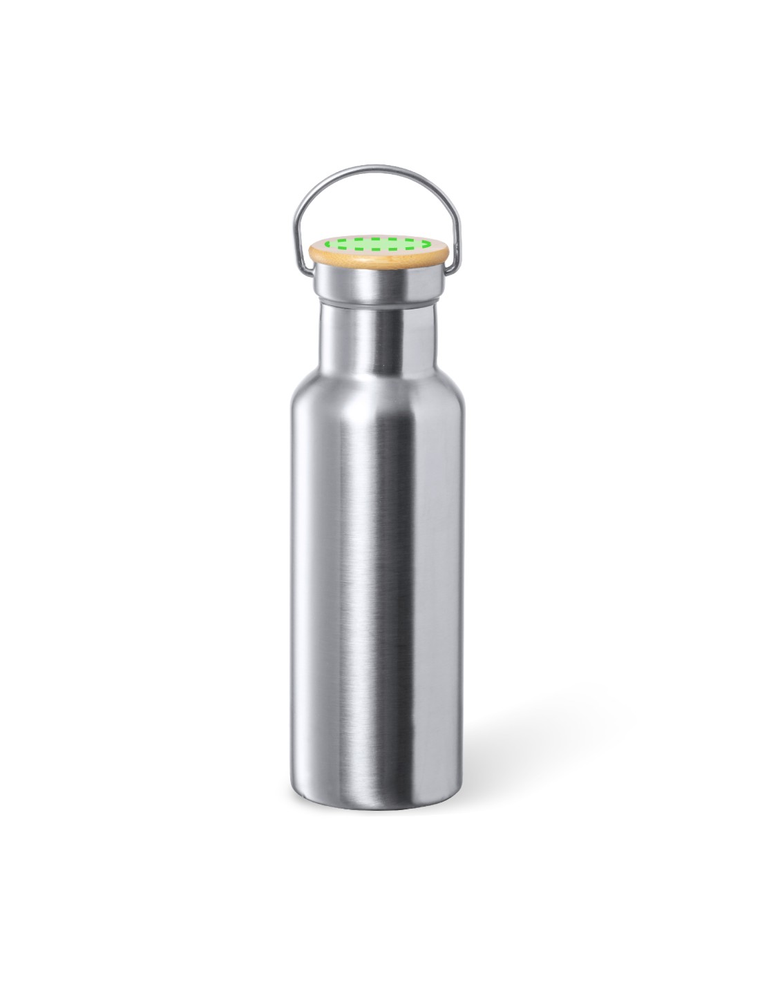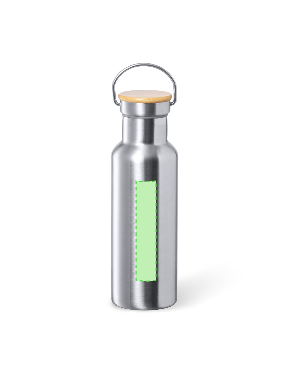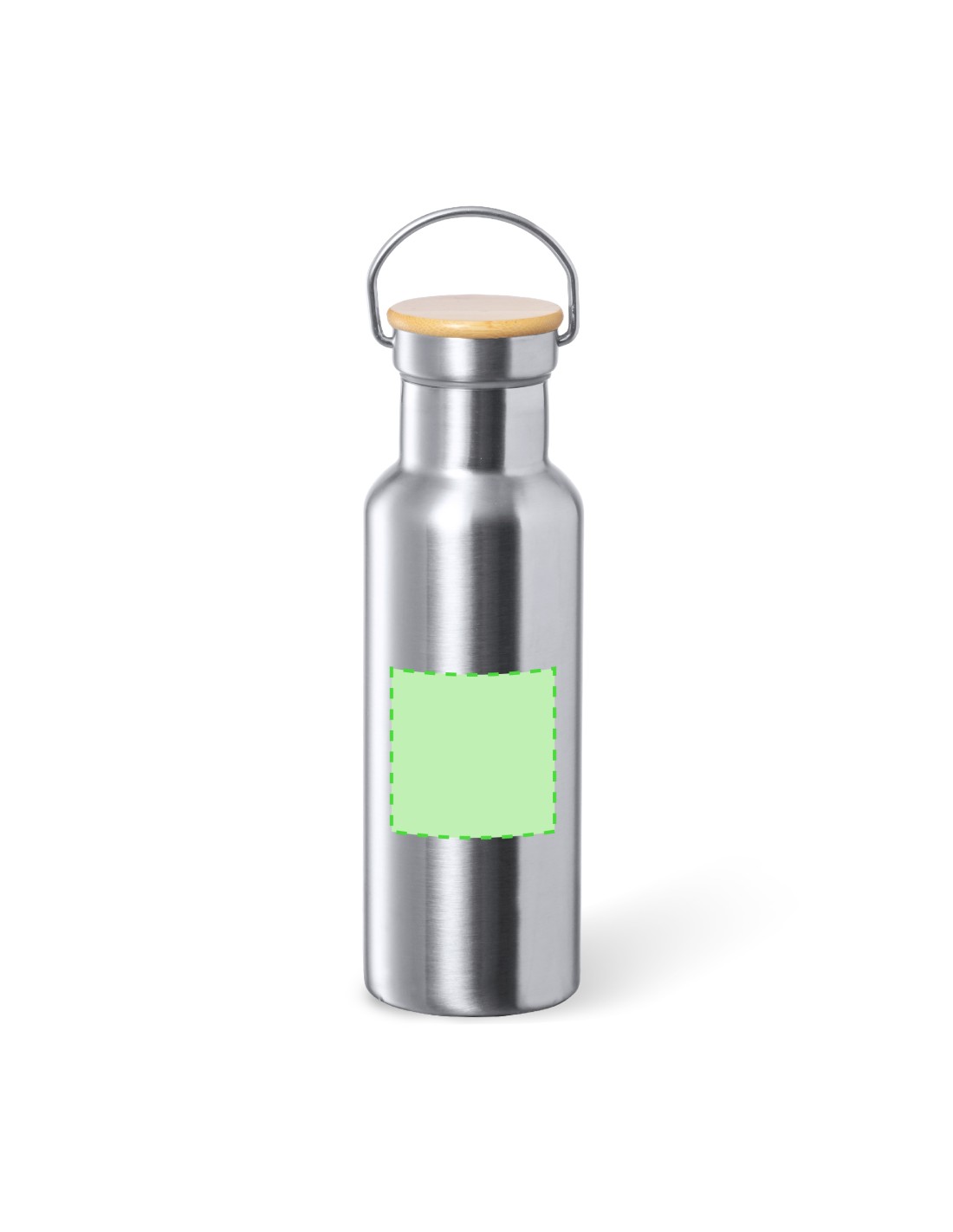 Bidón térmico de 500 ml de capacidad, fabricado en acero inox de doble pared y acabado mate. Incluye original tapón a rosca en acero inox, con detalle de bambú y asa integrada. Libre de BPA y presentado en caja individual de diseño kraft.