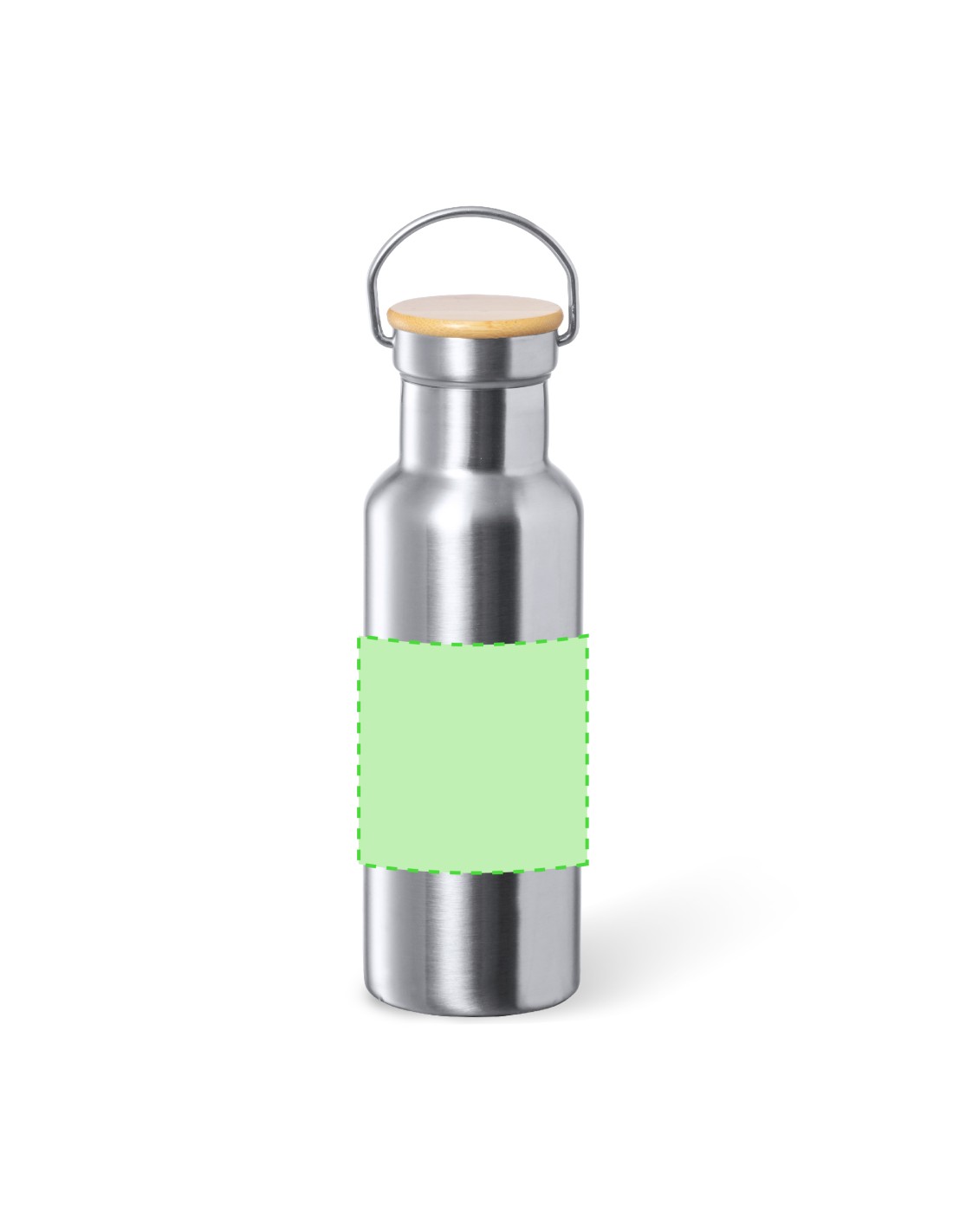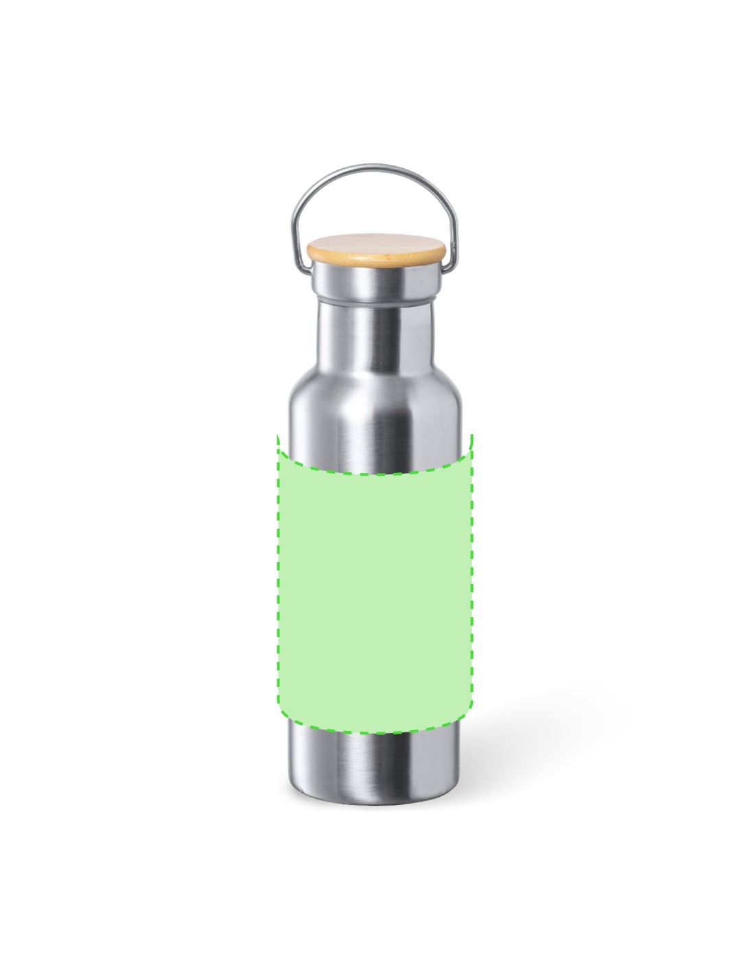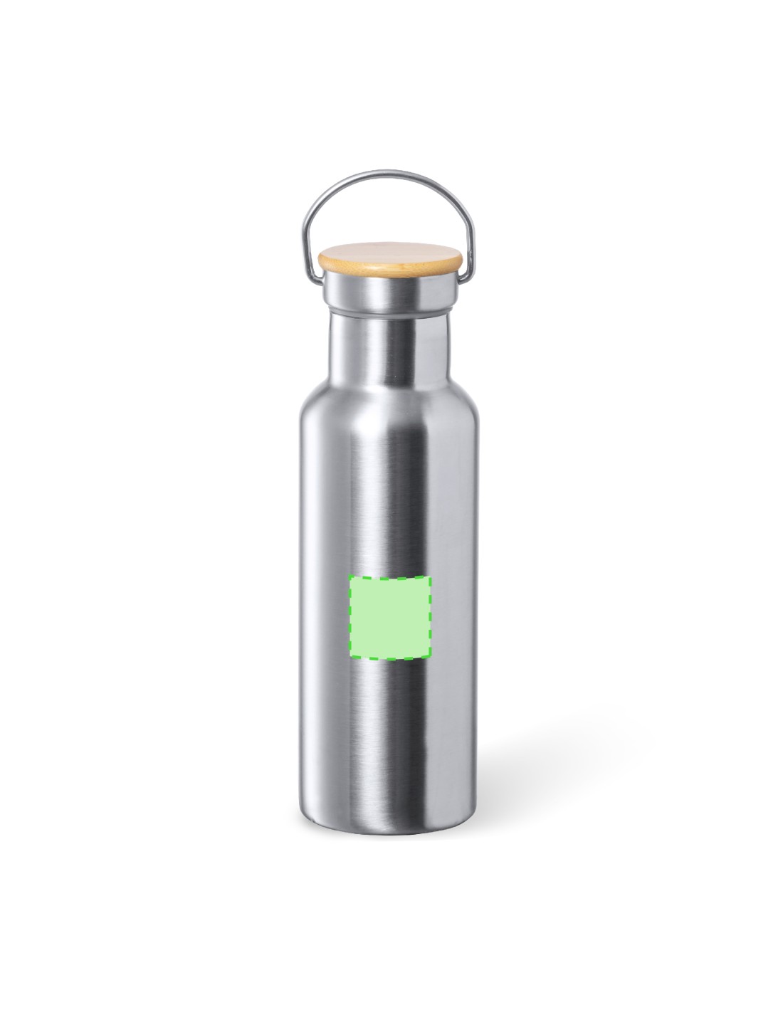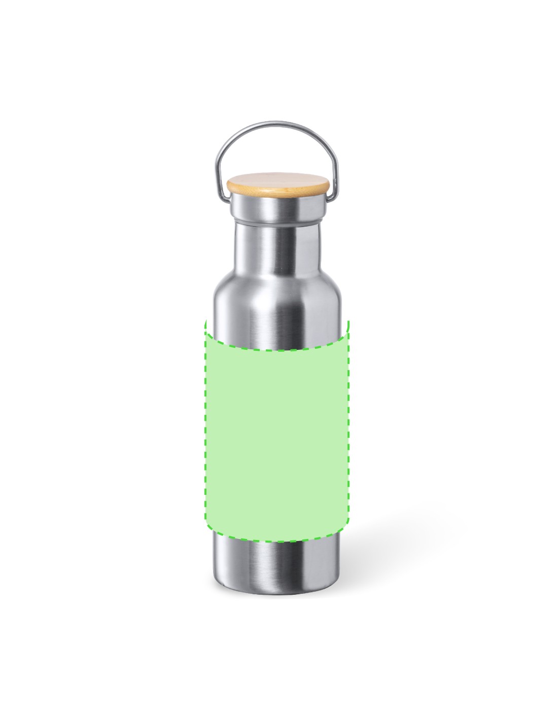 Bidón térmico de 500 ml de capacidad, fabricado en acero inox de doble pared y acabado mate. Incluye original tapón a rosca en acero inox, con detalle de bambú y asa integrada. Libre de BPA y presentado en caja individual de diseño kraft.