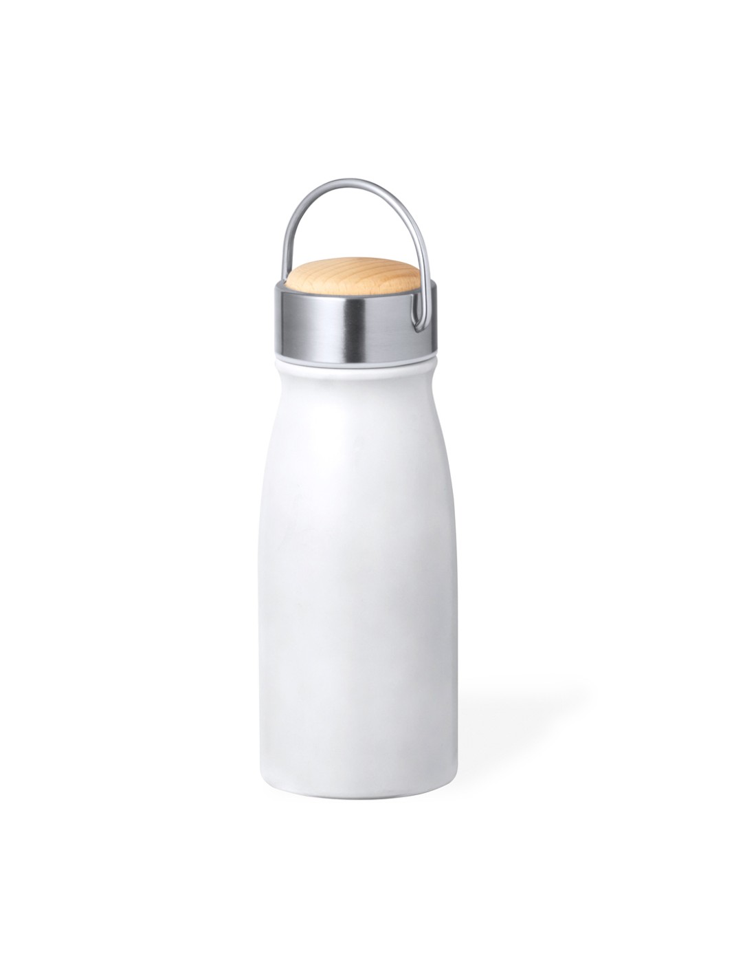 Bidón térmico de doble capa con original estilo y 350 ml de capacidad. Cuerpo en acero inox con tapón de seguridad a rosca en acero inox, con detalle en madera y asa integrada. Disponible en variada gama de colores. Presentado en caja individual de diseño eco en cartón kraft.